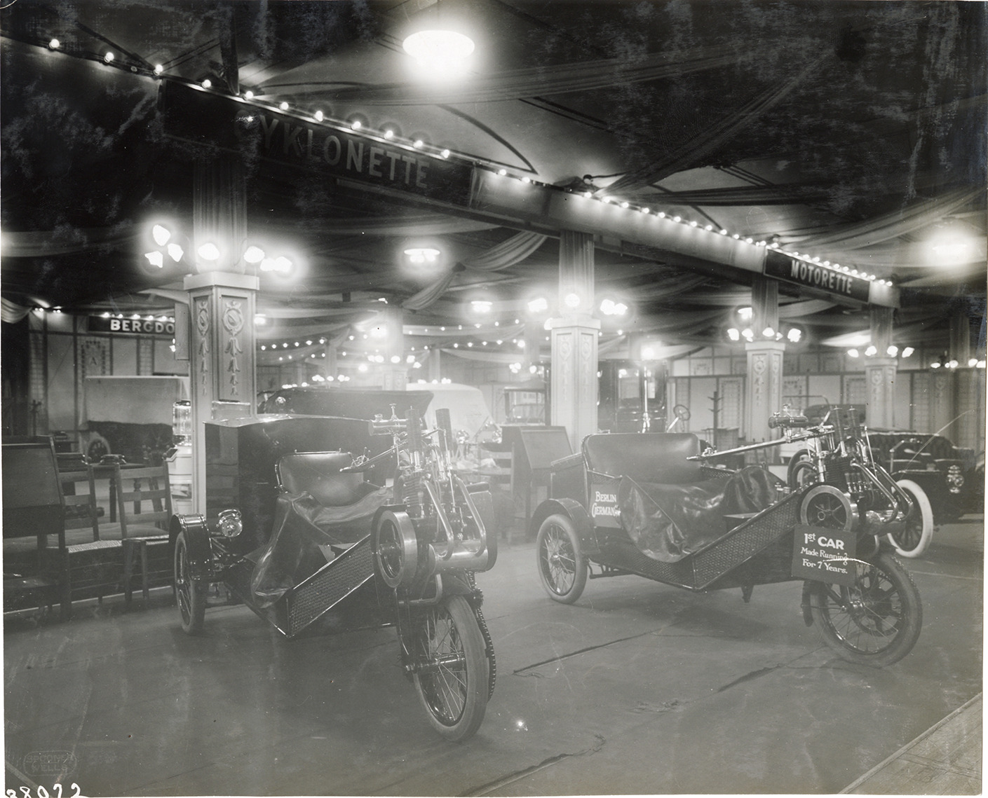 View of two 1910 Cyklonette three-wheeled cars on display at trade show; "Cyklonette" sign over display. Sign on car reads: "1st car made running for 7 years." Stamped on back: "Spooner & Wells, Inc., photographers, telephones 3472-3473 Columbus, 1931 Broadway, New York." Handwritten on back: "Cyklonette, 1910."