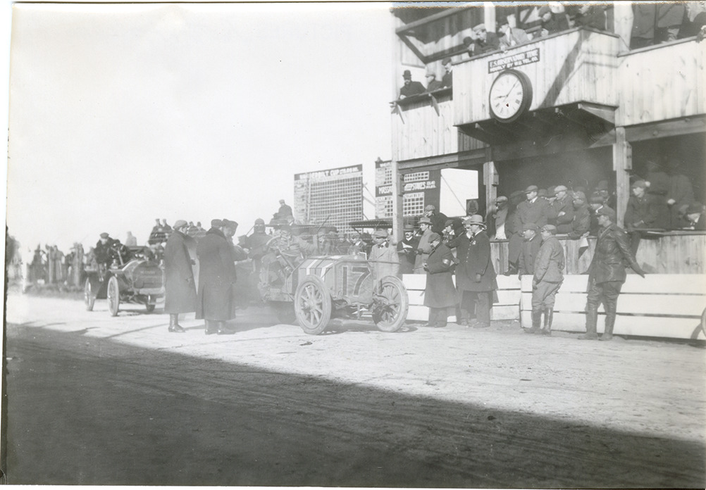 View of Joe Seymour in Isotta-Fraschini car no. 17 in front of timers' and officials' stand during the 1909 Vanderbilt Cup races on Long Island, New York. Spectators in background. Handwritten on back: "Seymour, Isotta, Vanderbilt, 1909."