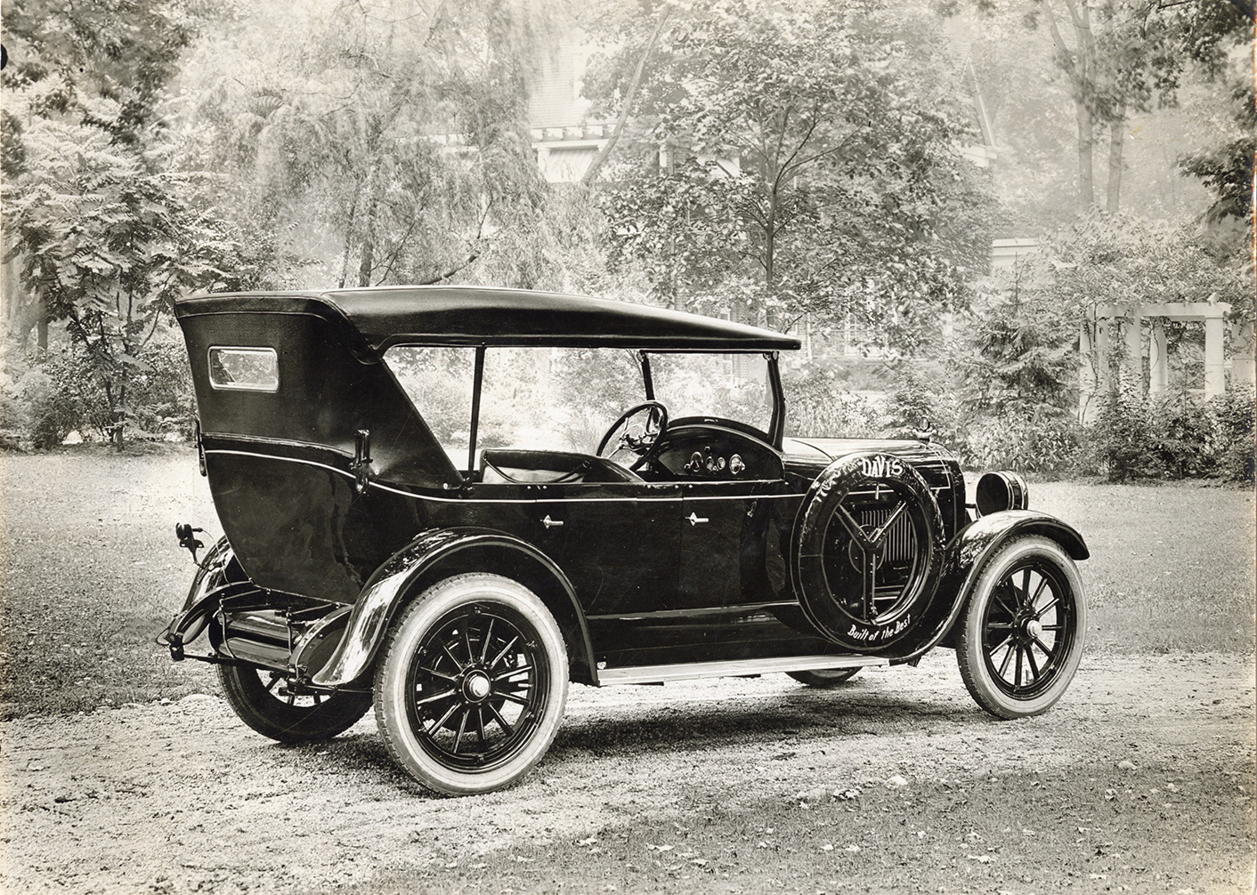 View of a 1915 Davis touring car. Label on back: "The Davis touring car, manufactured by the George W. Davis Motor Car Company, Richmond, Indiana. Price $1795, at the factory. Finished in Midnight Blue or Deep Maroon. Specifications include Continental 7R motor, Borg & Beck clutch, Delco starting-Lighting-ignition, Timken axles, Warner Corporation transmission and steering gear, 6-inch semi-heat treated steel frame. Equipment includes, Boyce Motometer, winged aluminum radiator cap, 4 cord tires, drum headlamps, clear-vision side curtains." Handwritten on back: "1915 Davis touring."