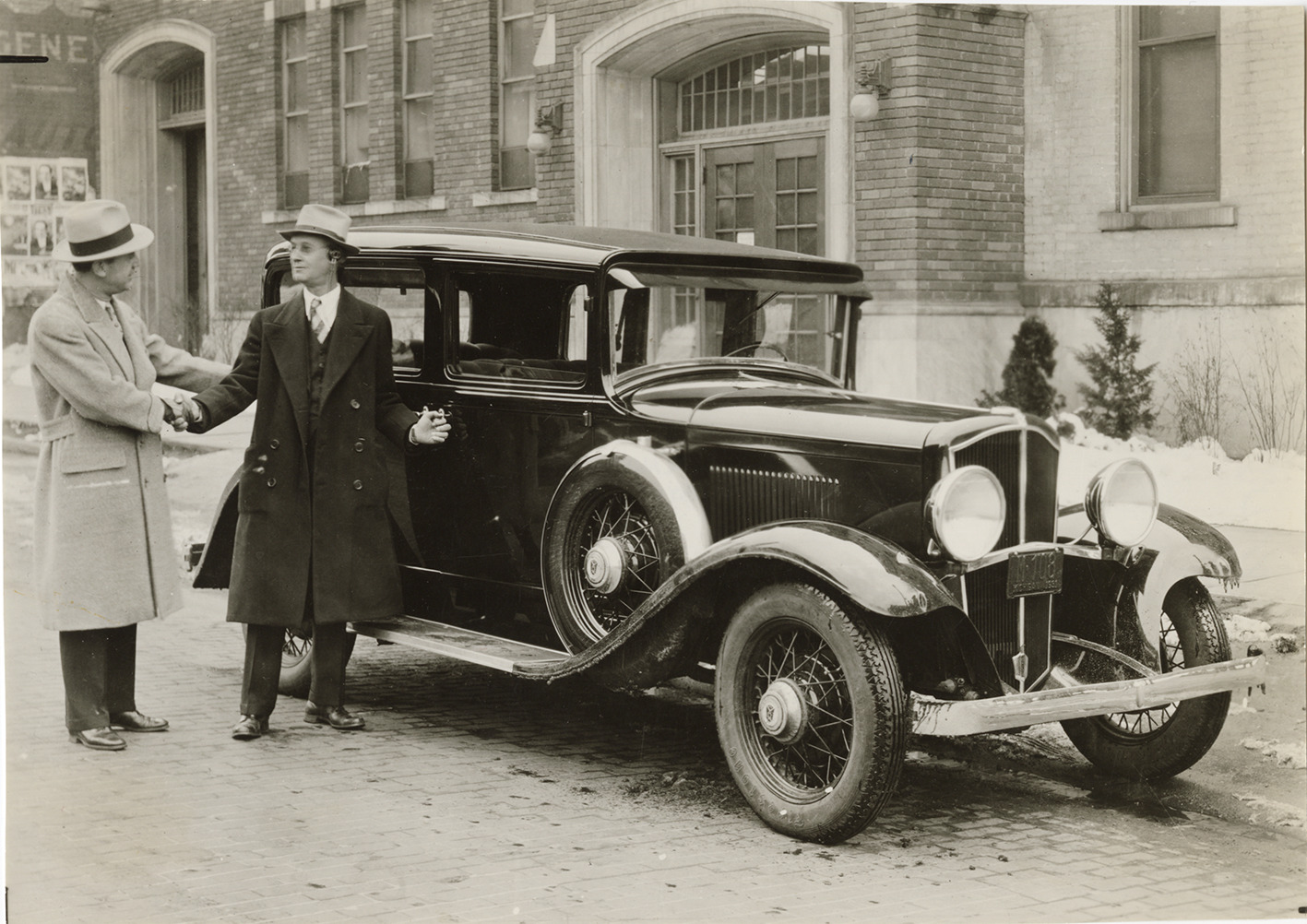 View of C.C. Kuennen and F.C. Kennedy with a 1931 DeVaux car. Label on back: "Grand Rapids, March 14, 1931. C.C. Kuennen, western Michigan distributor for the new DeVaux Six, had his first ride this week in the car he is selling. Photo shows Kuennen being congratulated by F.C. Kennedy, Regional Sales Manager (left) as the first Grand Rapids man to ride in the new DeVaux. Kuennen's initial ride came two months after he was appointed Grand Rapids distributor since the few cars available had been rushed to special showings and automobile shows in various parts of the country. Thousands crowded around the new car in front of the Kuennen show rooms and demonstrations were given to as many as possible. Those who were fortunate in having a chance to ride in the new car were frankly amazed at the performance of its Hall engine and the easy riding qualities of the car. Immediately after the demonstration the car was driven east by R.H. Mulch, General Sales Manager of the DeVaux-Hall Motors Corporation for special showings to the company's eastern distributors. 1931 DeVaux." Handwritten on back: "1931 DeVaux 6."