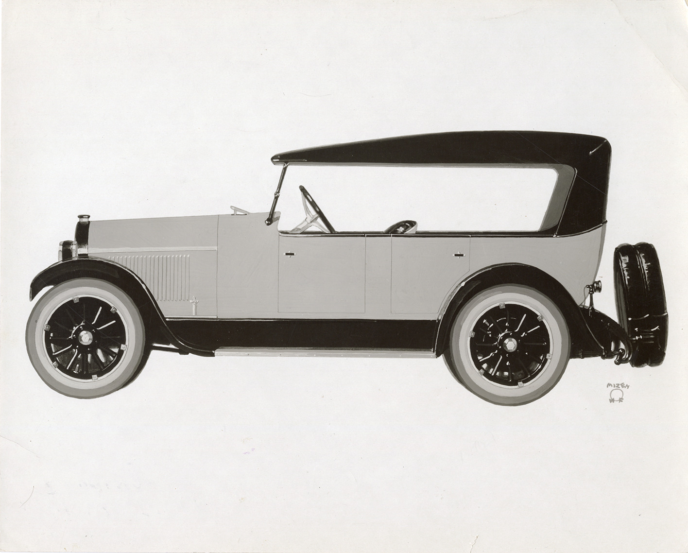 Favorite this☆ 1921 Wescott automobile Description: Artist's depiction of a 1917 Westcott car. Printed on front: "W.F. Mizen." Stamped on back: "Research Dept., Dec 19, 1921." Handwritten on back: "1921 Westcott touring, 5 pass. New model A-44. 1922 show." Details Resource ID: na051977 Creator: Mizen, W.F. Subject: Automobiles Westcott Motor Car Company Photographic prints Date Issued: 1921 Format: 1 photographic print ; 7.5 x 9.5 in. Member of: National Automotive History Collection Filing Location: Westcott Rights: Physical rights are retained by DPL. Copyright is retained in accordance with U.S. copyright laws.
