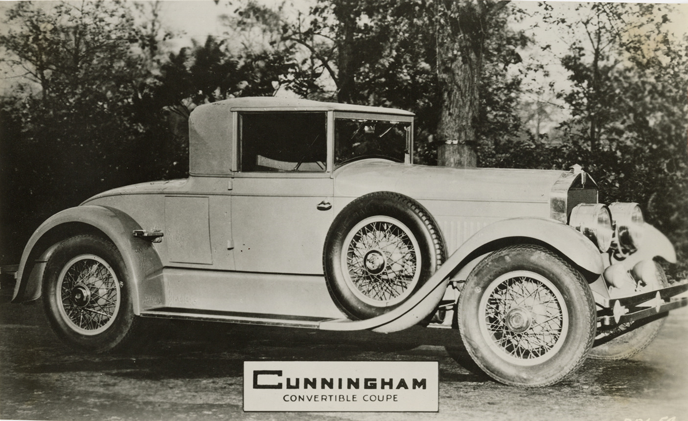 View of a 1929 Cunningham convertible coupe. Printed on front: "Cunningham convertible coupe." Handwritten on back: "1929 Cunningham convertible coupe."