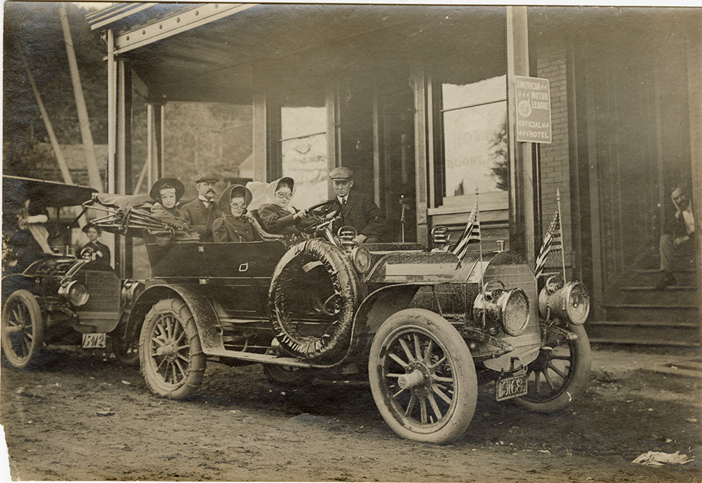 View of Mr. Bristol and motorists posing with a Pierce-Arrow car in front of the hotel at Suffern, New York during the 1906 Long Island Economy Run. Because Bristol injured his arm cranking his car and was unable to drive the car himself, he was disqualified from the competition. Stamped on back: "Photo by N. Lazarnick, 29 West 42nd Street, New York." Handwritten on back: "At the hotel at Suffern. Mr. Bristol who made good time but was disqualified on account of hurt of arm."