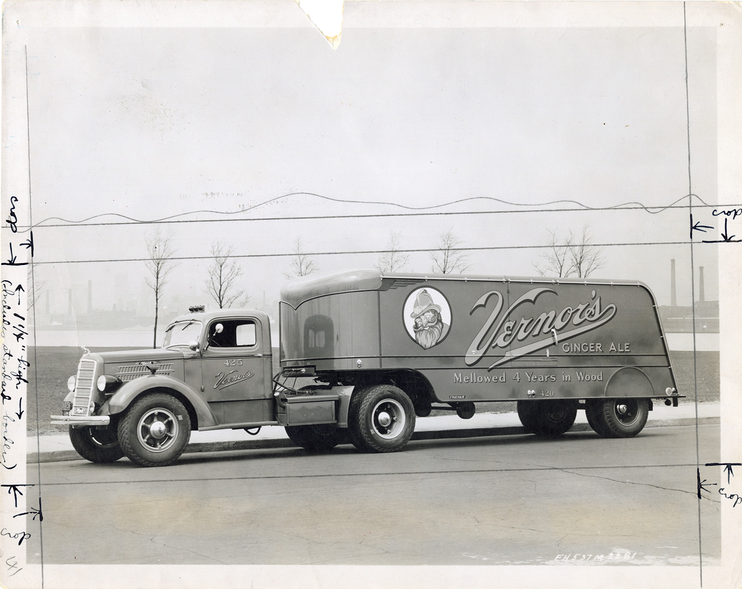 View of a Mack truck cab with a Fruehauf trailer transporting Vernor's ginger ale. Painted on trailer: "Vernor's ginger ale, mellowed 4 years in wood." Handwritten on back: "Mack Trucks, Inc."