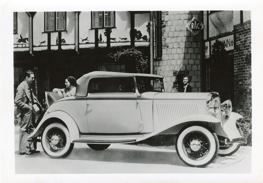 View of a man and woman posing with a 1932 Rockne car in front of the Fox & Hounds restaurant in Bloomfield Hills, Michigan. Handwritten on back: "1932 Rockne at Fox & Hounds, Bloomfield Hills."