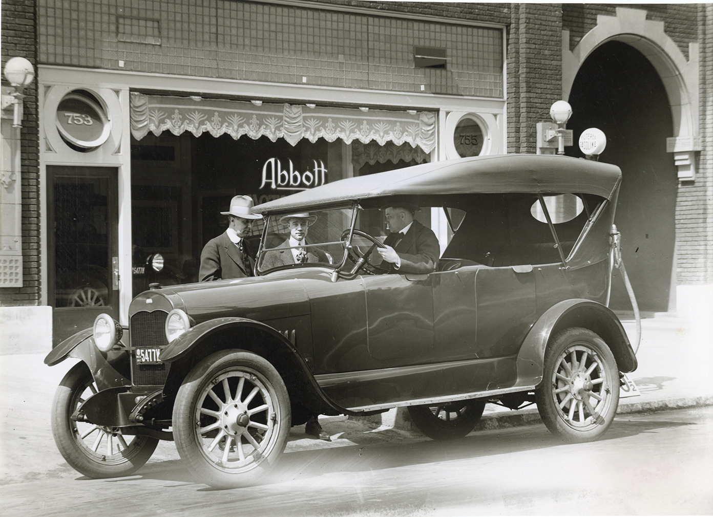 Favorite this☆ Men posing with 1917 Abbott-Detroit automobile Description: View of three men posing with a 1917 Abbott-Detroit car. "Abbott" painted in dealership window in background. Handwritten on back: "1917 Abbott." Details Resource ID: na052102 Subject: Automobiles Abbott Motor Company Photographic prints Date Issued: 1917 Format: 1 photographic print ; 7 x 9.25 in. Member of: National Automotive History Collection Filing Location: Abbott-Detroit Rights: Physical rights are retained by DPL. Copyright is retained in accordance with U.S. copyright laws.