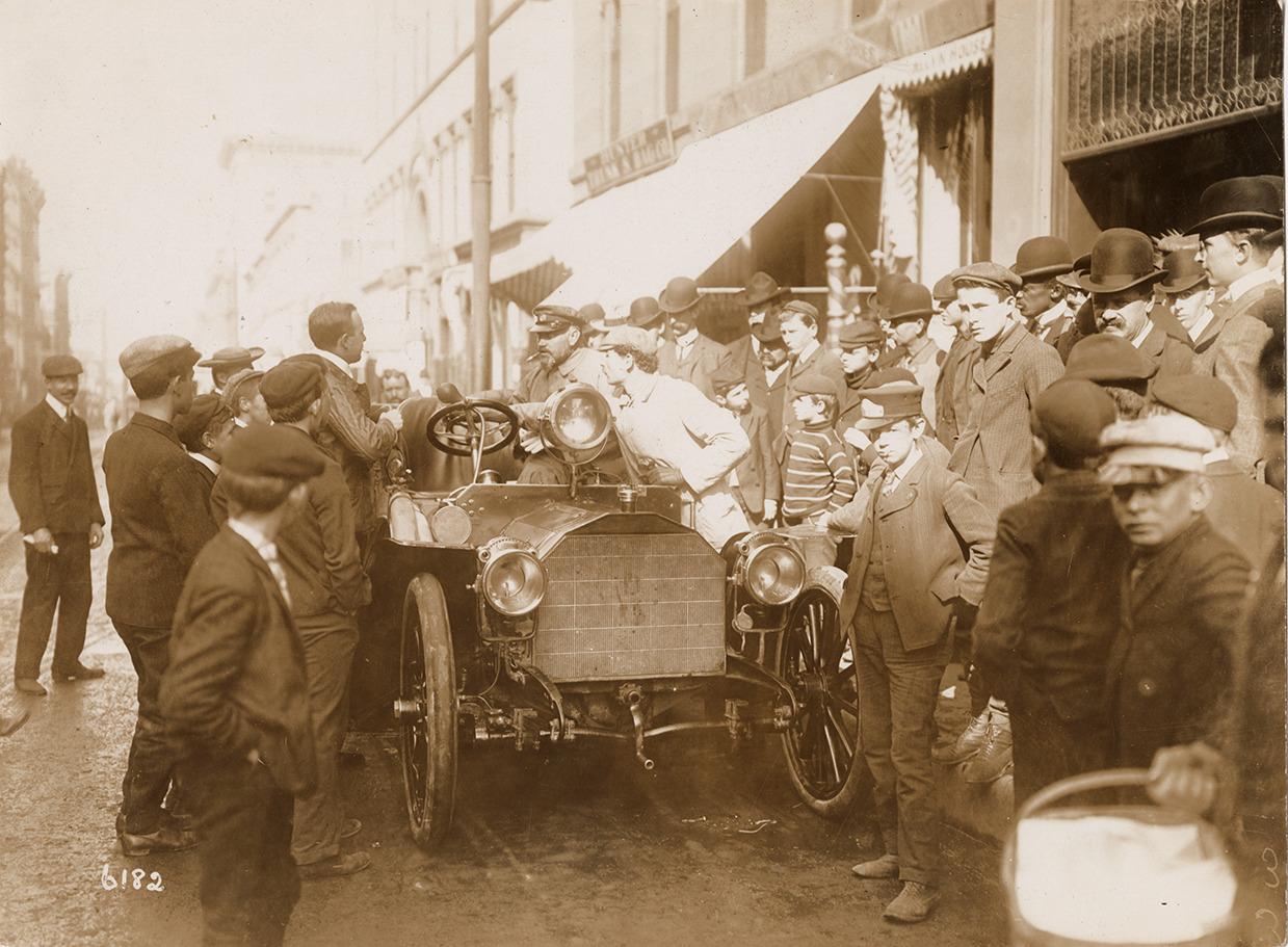 Motorists and onlookers surrounding 1905 American Mercedes automobile