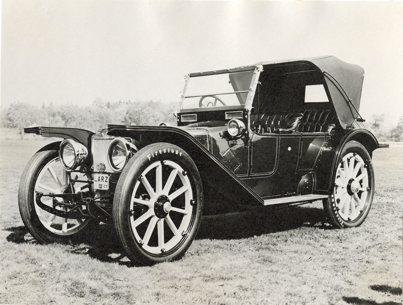 View of a 1910 American Underslung car. Handwritten on back: "1910 American Underslung."