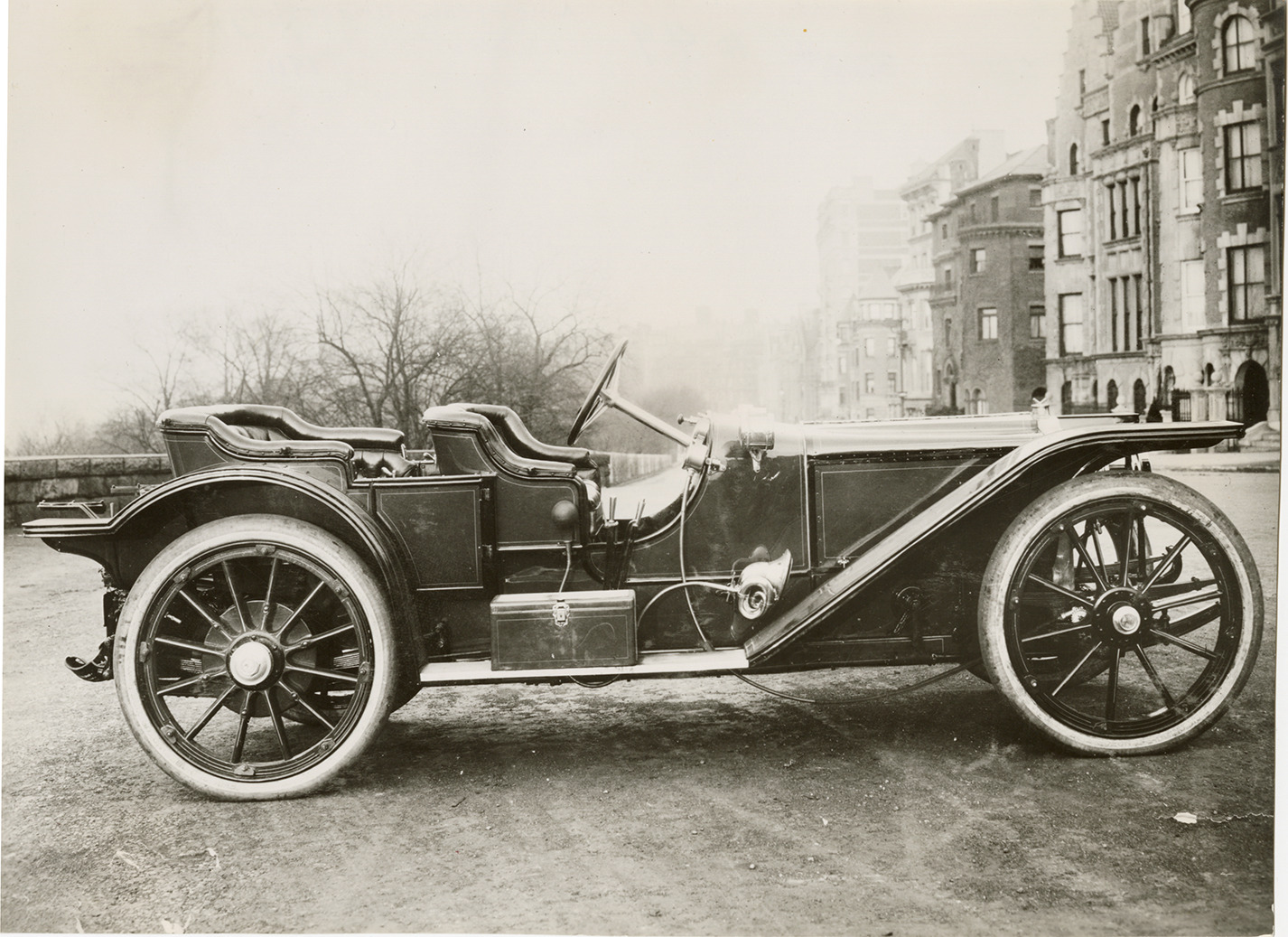 View of a 1911 American Underslung car. Handwritten on back: "American Underslung, 1911. $4000, 122 w.b., 50 h.p., 3000#."