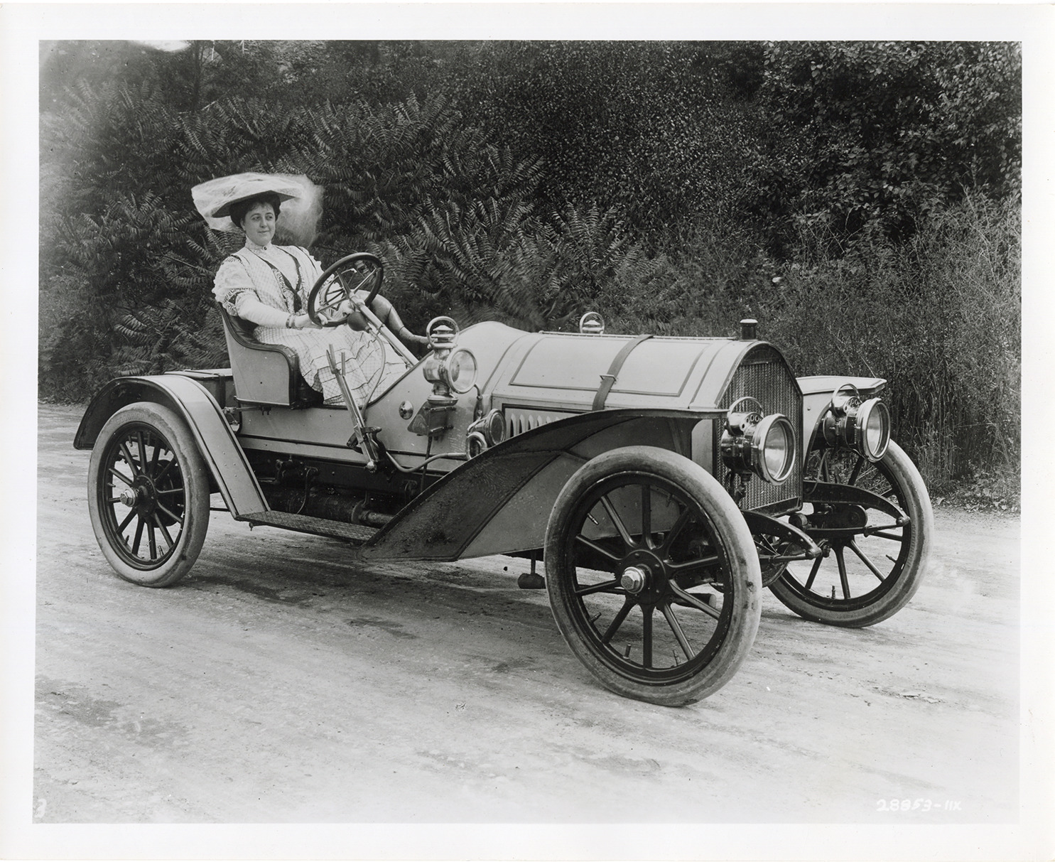 View of a woman motorist posing in a 1907 Blomstrom car. Stamped on back: "Davis B. Hillmer, commercial photography, 8825 Second Ave., Detroit 2, Michigan. TR 5-7620." Handwritten on back: "1907 Blomstrom."