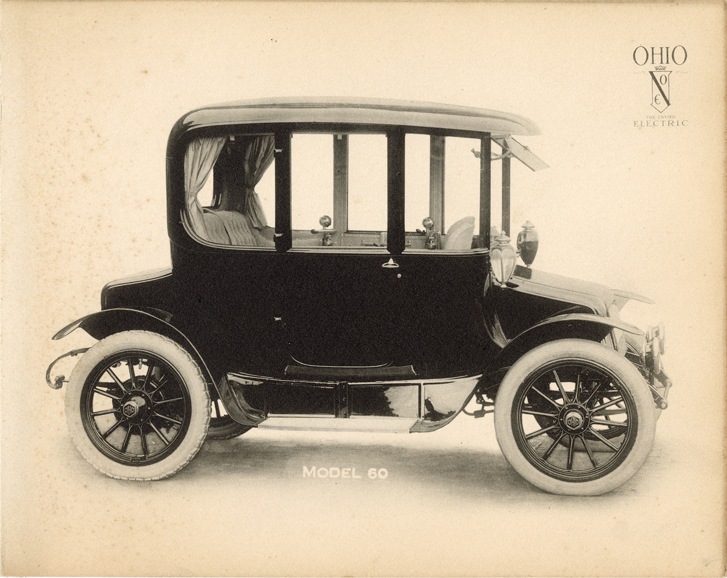 View of a 1915 Ohio Electric Model 60 car. Printed on front: "Ohio, the envied electric. Model 60." Handwritten on back: "1915 Ohio Electric, m'dl 60."