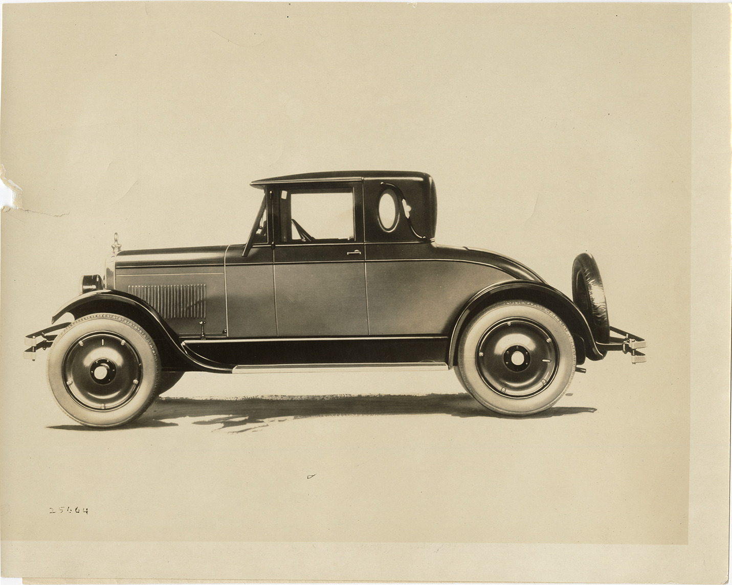 View of a 1925 Rollin coupe. Label on back: "The three-passenger Rollin coupe. A distinctive model of unusually graceful and compact lines, which affords ample room for three persons. The appointments of this car are of finest quality throughout, being designed for comfort and quiet elegance. The color-scheme is of Rollin Green, dark above the stream-line body bead, and light below, with Duco finish. Many accessories, such as automatic wind-shield cleaner and rear-vision mirror, are included as standard equipment." Handwritten on back: "1925 Rollin car."