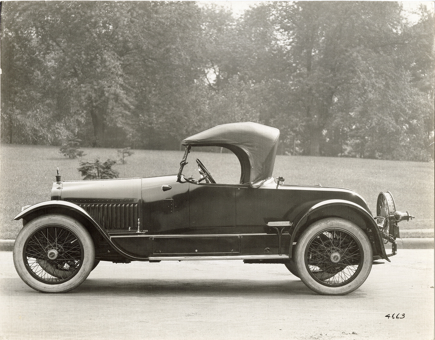View of a 1917 White roadster. Handwritten on back: "1917 White. White 16 valve, 4 cylinder, special three passenger roadster. The large compartment on the side is for carrying golf bags. This car was built for Miss Elizabeth Parsons of Columbus, Ohio. Nov 23/17."