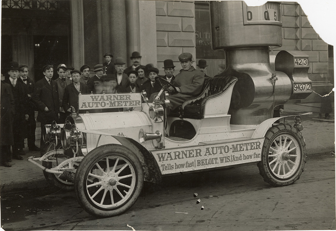 View of driver posing in the Warner Auto-Meter car. Car body is shaped like an Auto-Meter; sign on side of car reads: "Warner Auto-Meter, tells how fast and how far, Beloit, Wis." Onlookers in background. Stamped on back: "Lazarnick, photographic illustrations, 230 Park Avenue, New York Central Building, New York City, Tel. Vanderbilt 3-0011-2-3-4." Handwritten on back: "Accessories."