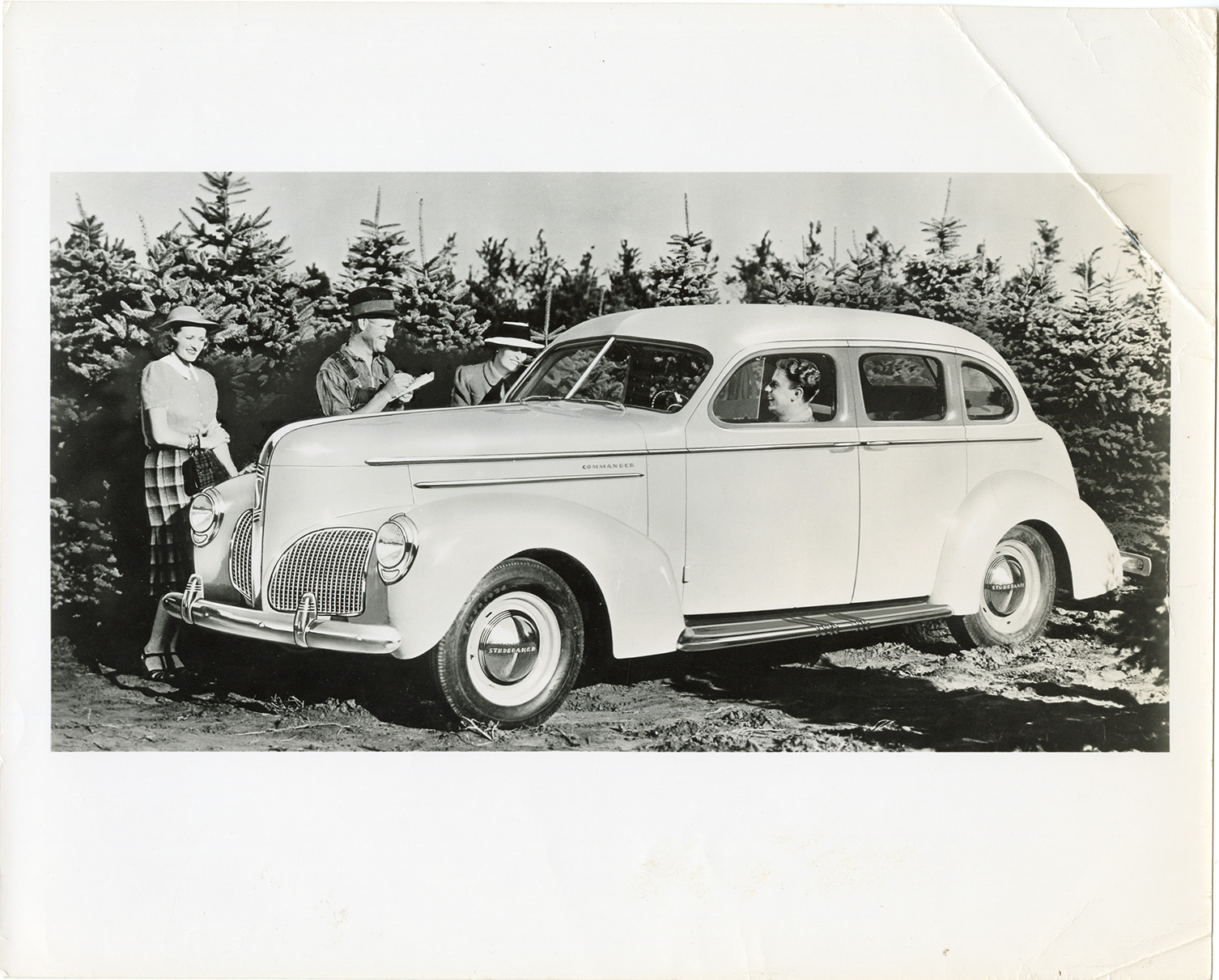 View of men and women posing with a 1939 Studebaker Commander car at a Christmas tree farm. Stamped on back: "Studebaker, South Bend, Indiana." Handwritten on back: "1939 Commander."