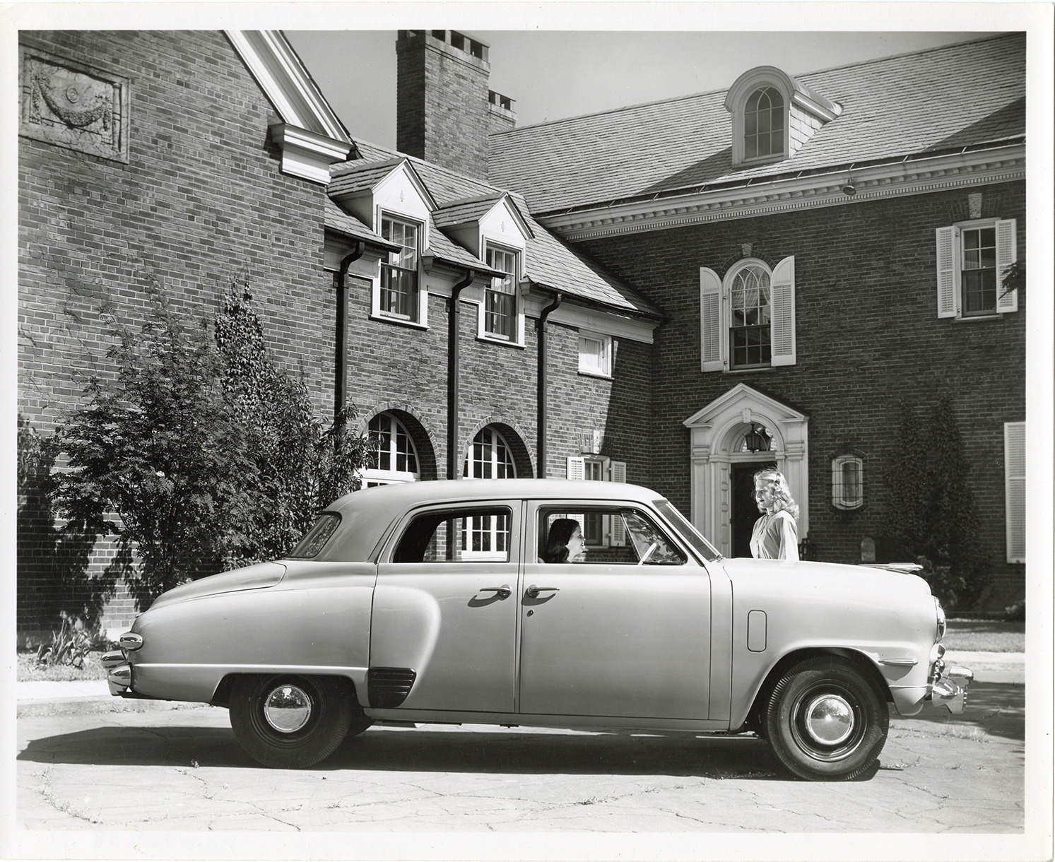 View of two women posing with a 1947 Studebaker Champion sedan. Brick house in background. Stamped on back: "Studebaker, South Bend, Indiana." Handwritten on back: "1947 Champion sedan."