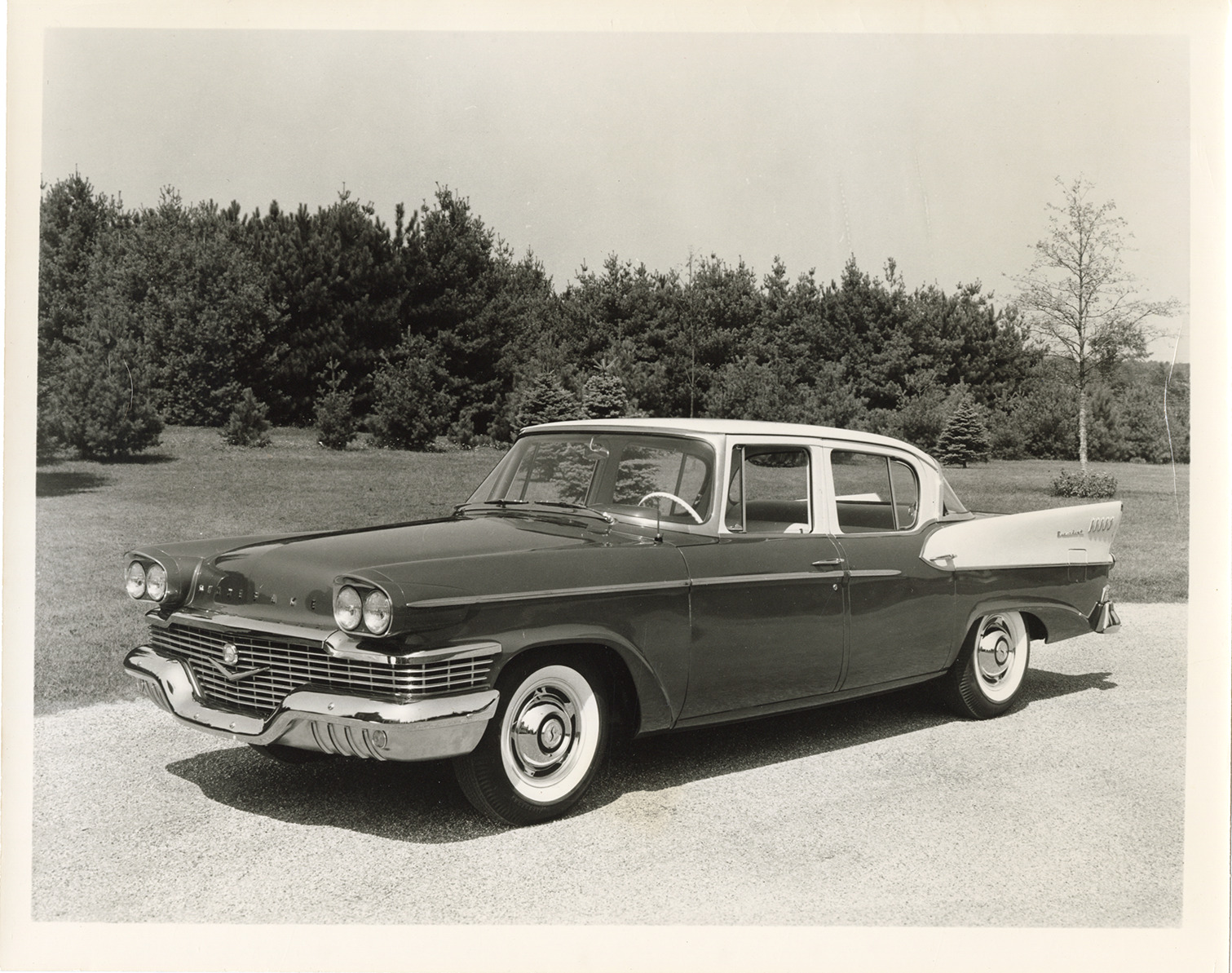 View of a 1958 Studebaker President sedan. Handwritten on back: "1958 Studebaker President."