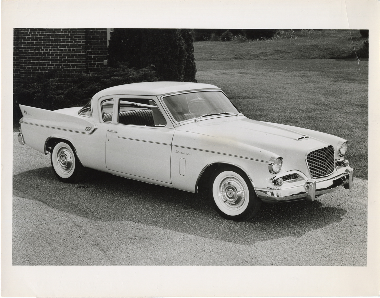 View of a 1960 Studebaker Hawk coupe. Label on back: "For release October 9, 1959. Sleek, classic sport car styling and a new, larger V-8 engine, that's the Studebaker Hawk for 1960. This five-passenger coupe will also feature a new heavy duty transmission, larger clutch, finned brake drums and dual exhausts. Designed to run economically on a regular gasoline, Hawks are available with either conventional, overdrive or automatic transmissions." Handwritten on back: "1960 Hawk."