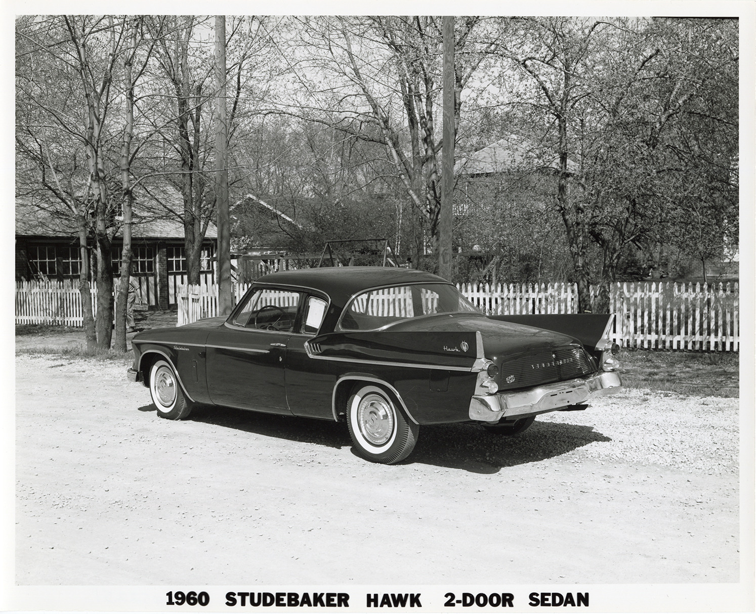 View of a 1960 Studebaker Hawk coupe. Houses and fence in background. Printed on front: "1960 Studebaker Hawk, 2-door sedan [sic]." Stamped on back: "Please credit Terry Thurn, photography. 9624 Lenore, UN. 4-5666. Detroit 39, Michigan." Handwritten on back: "Studebaker, 1960."