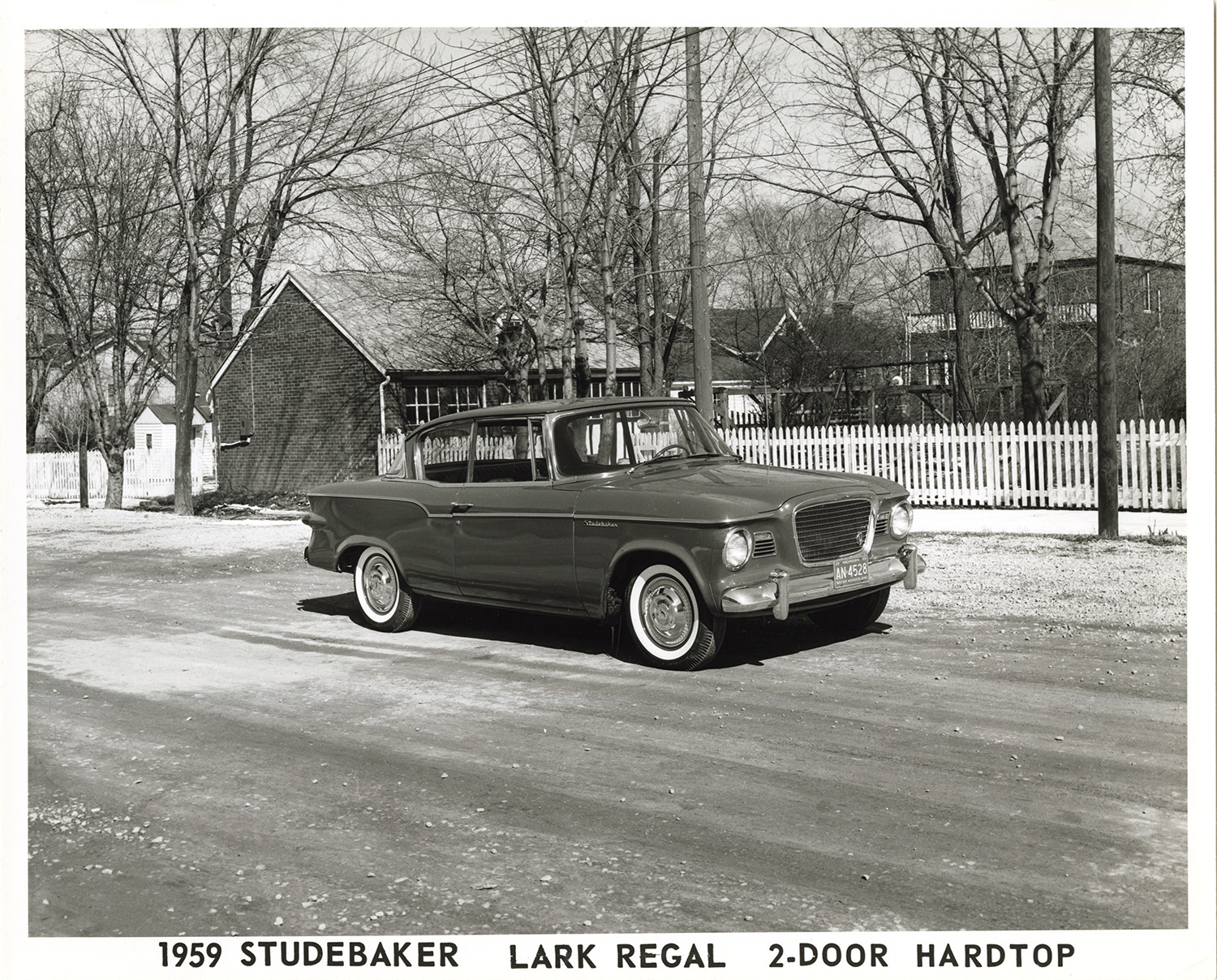 View of a 1959 Studebaker Lark Regal coupe. Houses and fence in background. Printed on front: "1959 Studebaker Lark Regal 2-door hardtop." Stamped on back: "Please credit Terry Thurn, photography. 9624 Lenore, UN. 4-5666. Detroit 39, Michigan." Handwritten on back: "1959 Lark."
