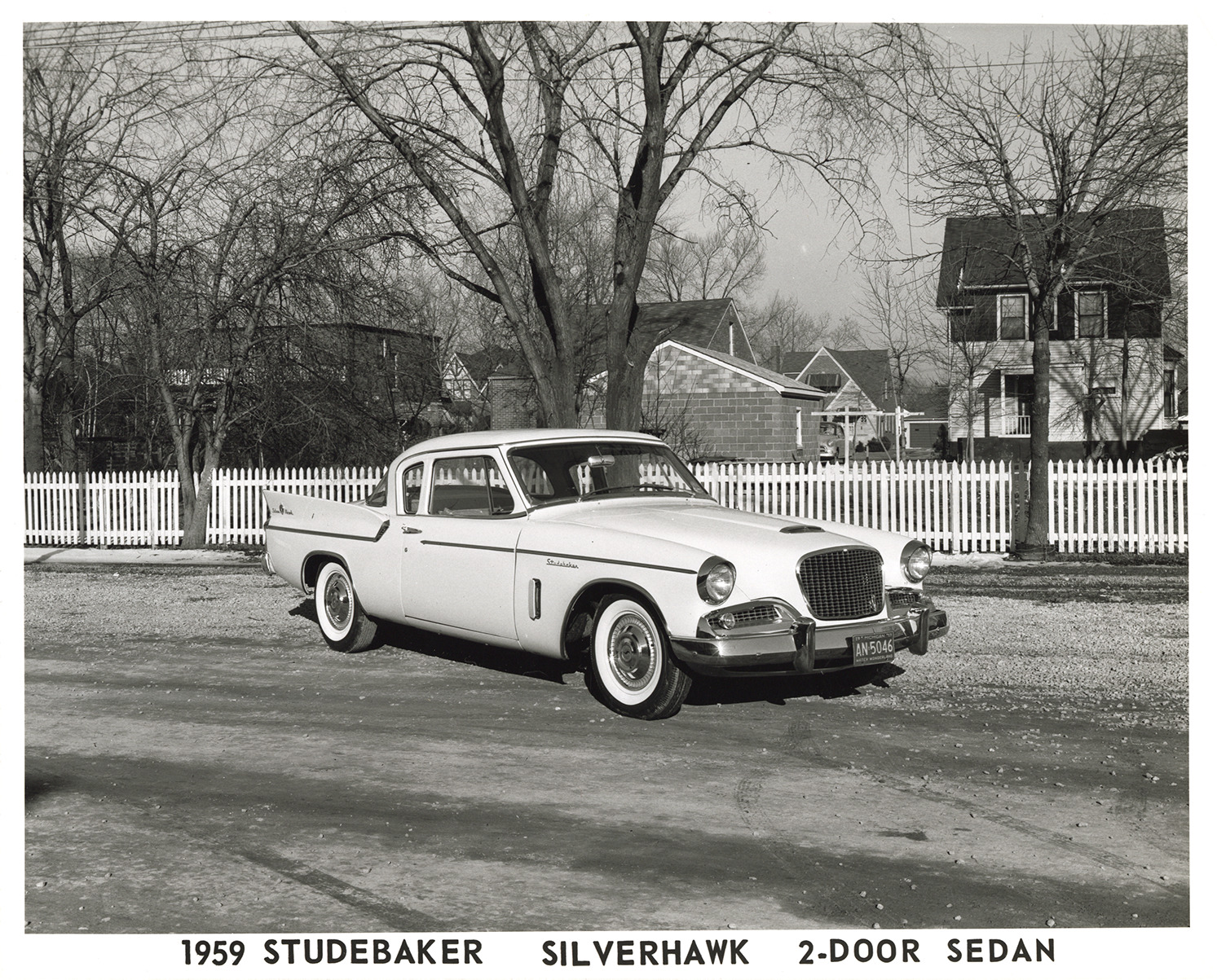 View of a 1959 Studebaker Silver Hawk coupe. Houses and fence in background. Printed on front: "1959 Studebaker Silverhawk [sic] 2-door sedan [sic]." Stamped on back: "Please credit Terry Thurn, photography. 9624 Lenore, UN. 4-5666. Detroit 39, Michigan." Handwritten on back: "Studebaker, 1959."