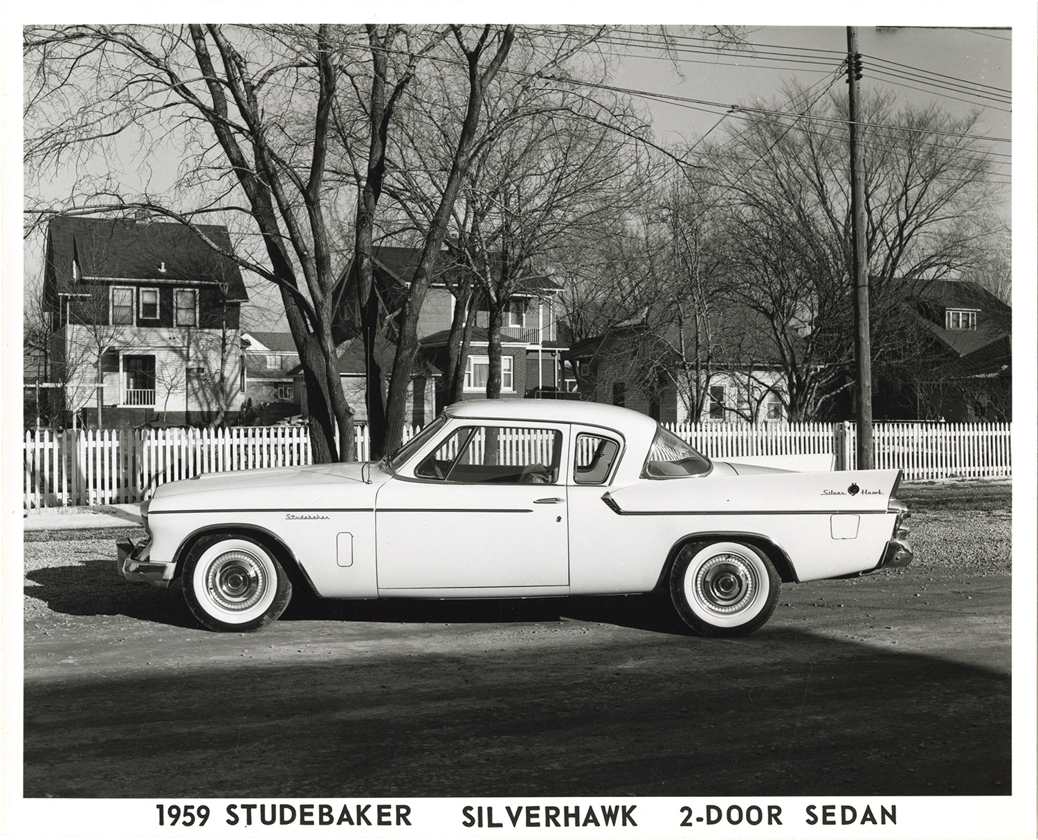 View of a 1959 Studebaker Silver Hawk coupe. Houses and fence in background. Printed on front: "1959 Studebaker Silverhawk [sic] 2-door sedan [sic]." Stamped on back: "Please credit Terry Thurn, photography. 9624 Lenore, UN. 4-5666. Detroit 39, Michigan." Handwritten on back: "Studebaker, 1959."