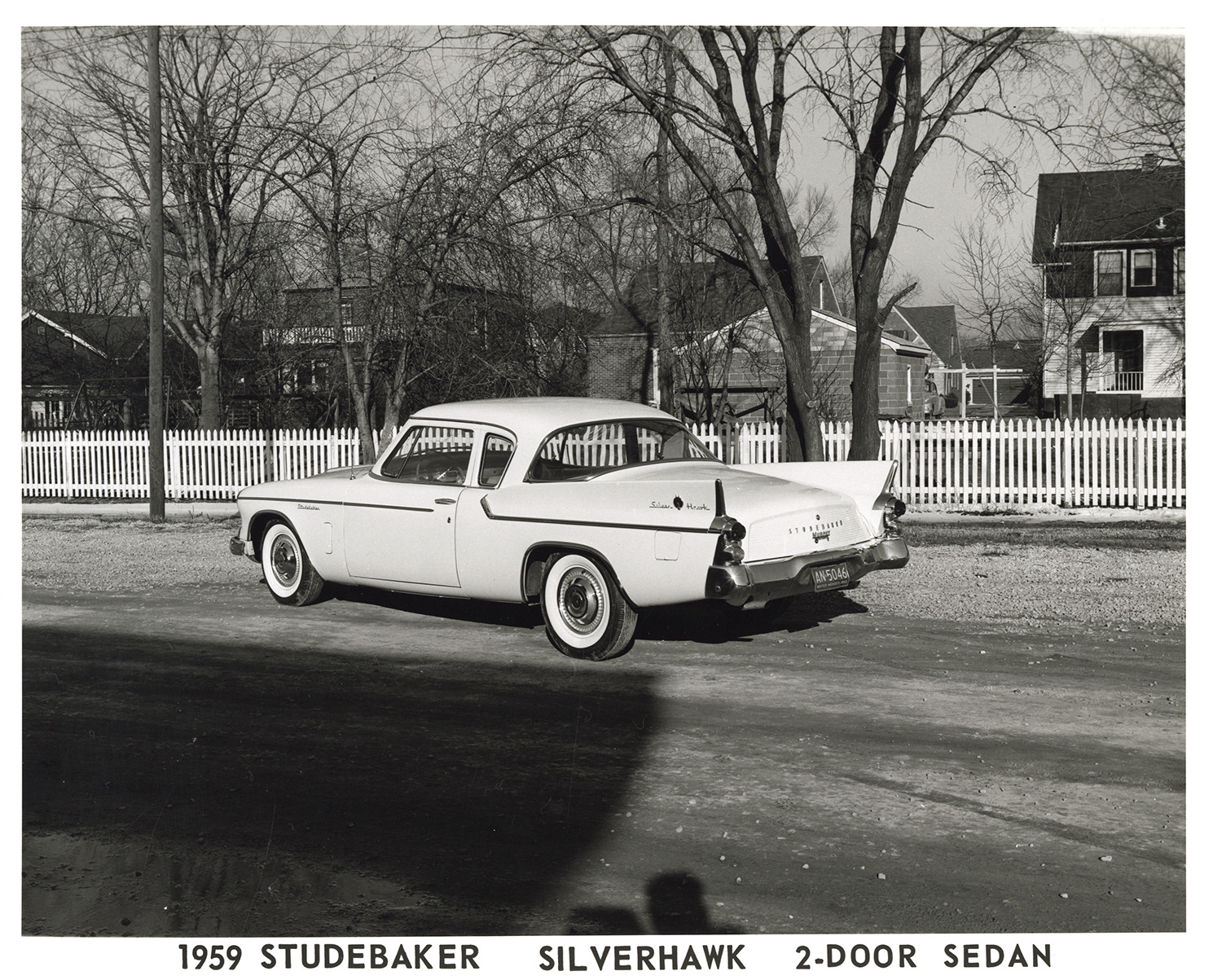 View of a 1959 Studebaker Silver Hawk coupe. Houses and fence in background. Printed on front: "1959 Studebaker Silverhawk [sic] 2-door sedan [sic]." Stamped on back: "Please credit Terry Thurn, photography. 9624 Lenore, UN. 4-5666. Detroit 39, Michigan." Handwritten on back: "1959 S. Silverhawk."