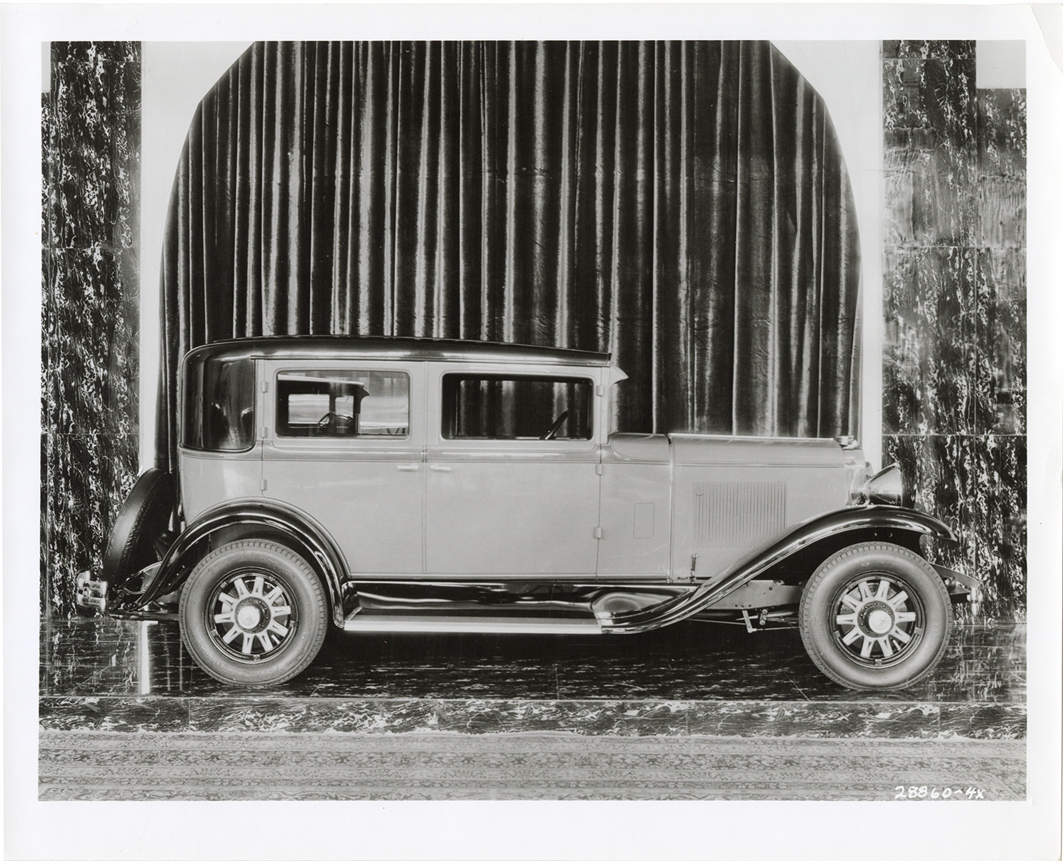 View of a 1926 Stutz car in showroom. Stamped on back: "Davis B. Hillmer, commercial photography. 8825 Second Ave., Detroit, Michigan. TR 5-7620." Handwritten on back: "1926 Stutz."