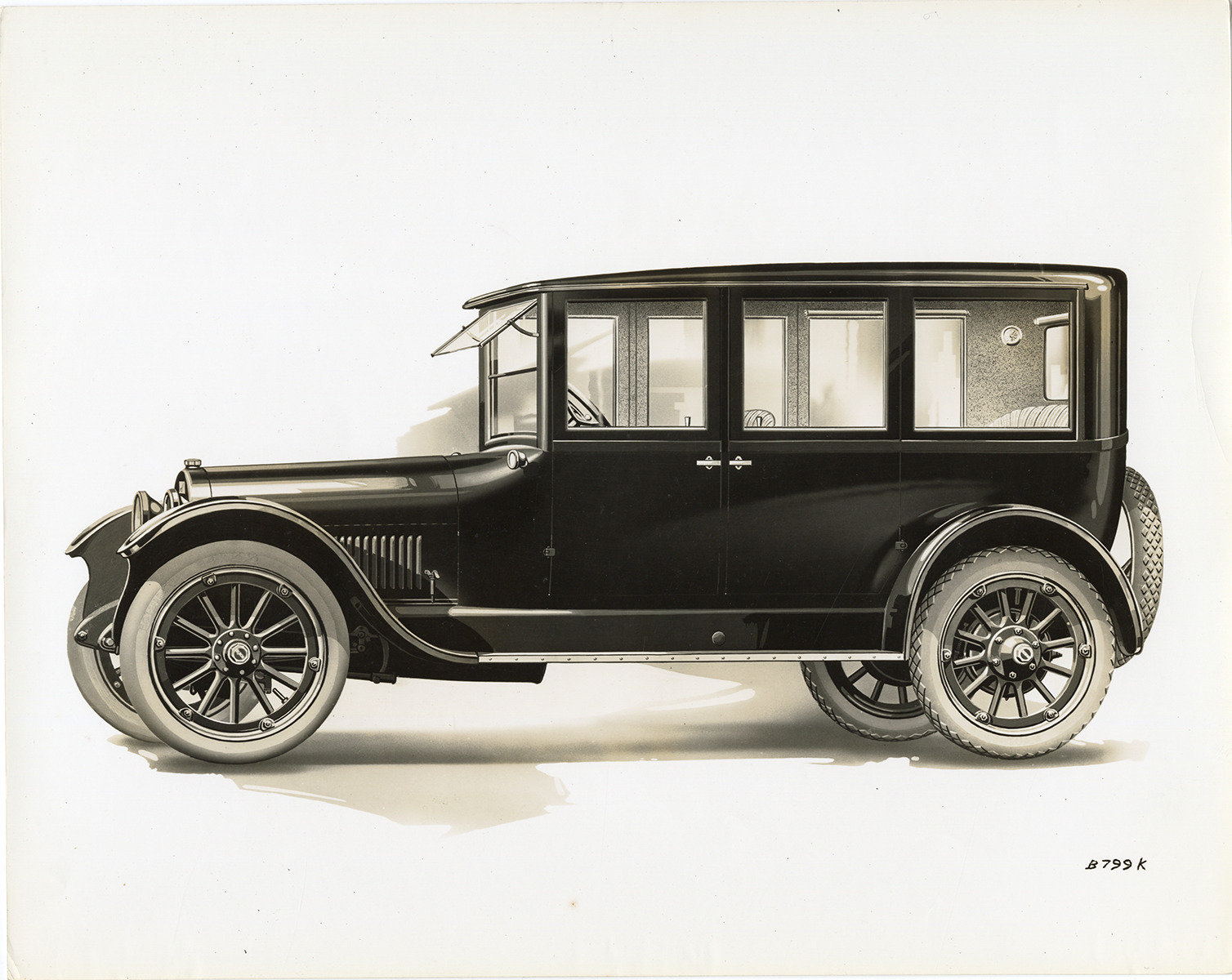 Artist's depiction of a 1919 Buick Model H-50 car. Handwritten on back: "Buick 1919, H series, Model H-50. List price=$2585. Wheel base=124". Six cylinder. Bore & stroke=3 3/8 x 4 1/2."