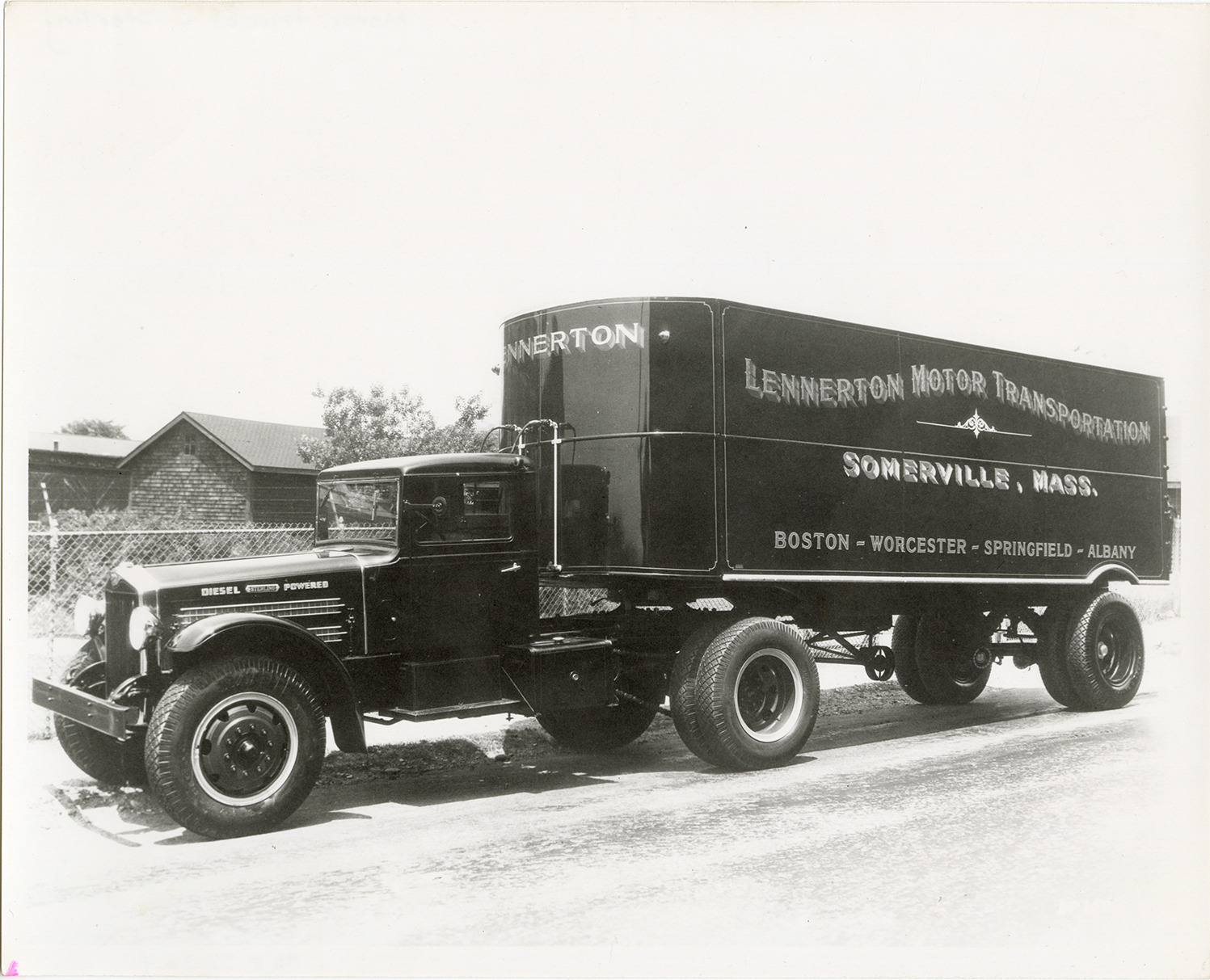 Favorite this☆ Sterling truck, Lennerton Motor Transportation Description: View of a Sterling truck, owned by Lennerton Motor Transportation in Somerville, Massachusetts. Lettered on trailer: "Lennerton Motor Transportation, Somerville, Mass. Boston, Worcester, Springfield, Albany." Details Resource ID: na052324 Subject: Sterling trucks Truck trailers Diesel trucks Photographic prints Date Issued: Unknown year Format: 1 photographic print ; 8 x 10 in. Member of: National Automotive History Collection Filing Location: Motor trucks--Sterling Rights: Physical rights are retained by DPL. Copyright is retained in accordance with U.S. copyright laws.