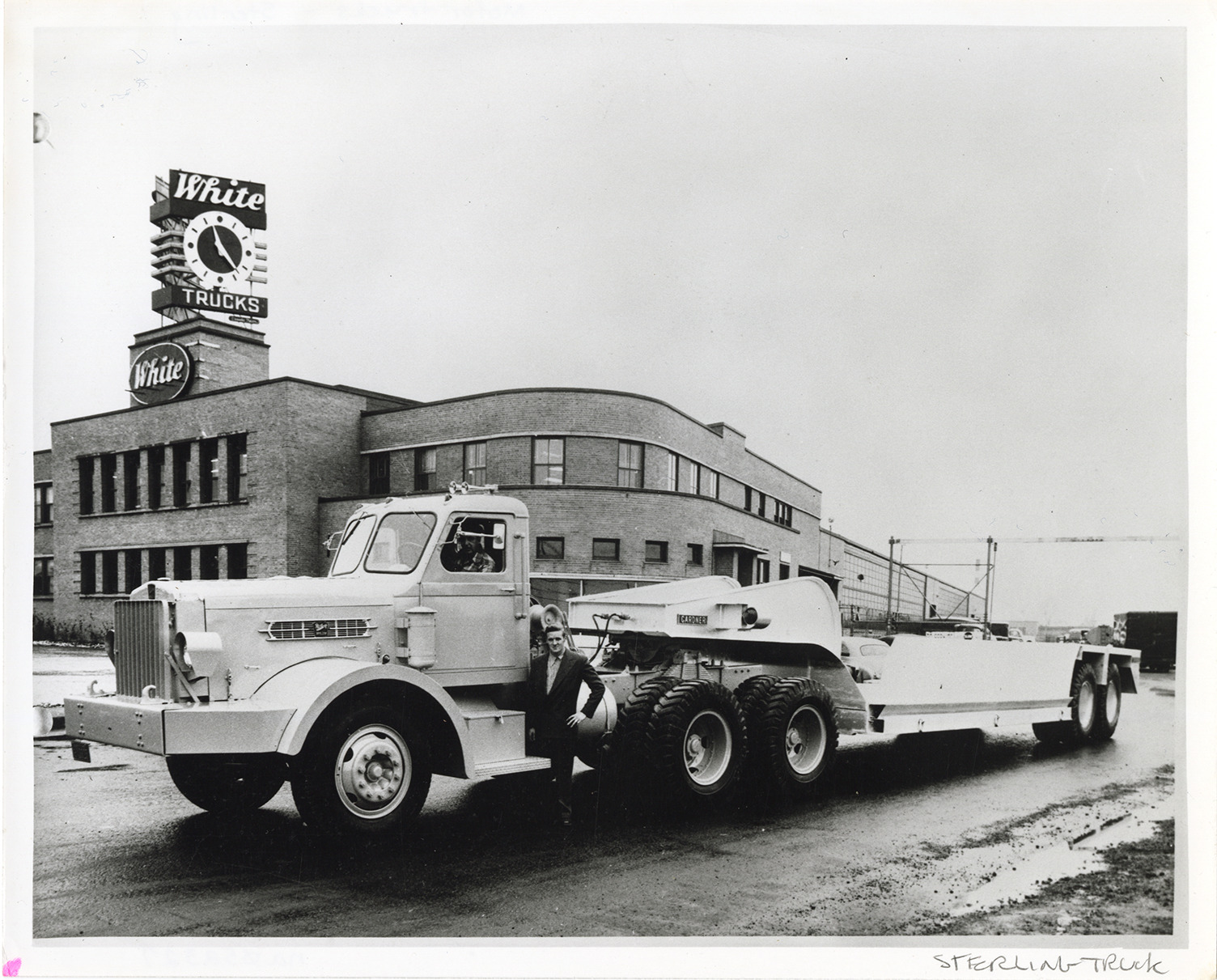 Favorite this☆ Two men posing with Sterling truck Description: View of driver and another man posing with a Sterling truck. White trucks building in background; White trucks sign and clock on building. Handwritten on front: "Sterling truck." Details Resource ID: na052327 Subject: Sterling trucks White Company Clocks and watches Photographic prints Date Issued: Unknown year Format: 1 photographic print ; 8 x 10 in. Member of: National Automotive History Collection Filing Location: Motor trucks--Sterling Rights: Physical rights are retained by DPL. Copyright is retained in accordance with U.S. copyright laws.