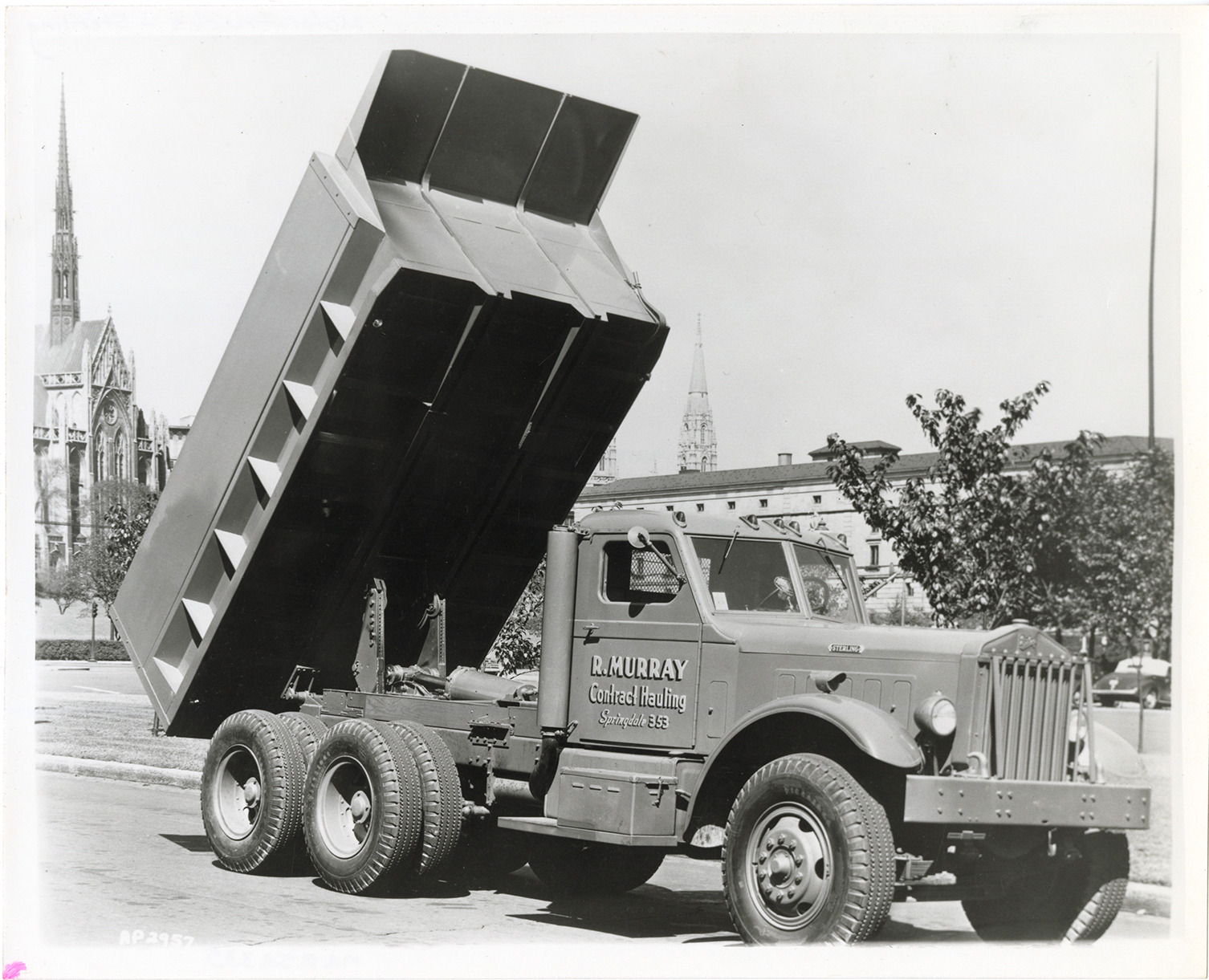 View of a Sterling dump truck, owned by R. Murray Contract Hauling. Lettered on cab: "R. Murray Contract Hauling, Springdale 353." Churches in background.