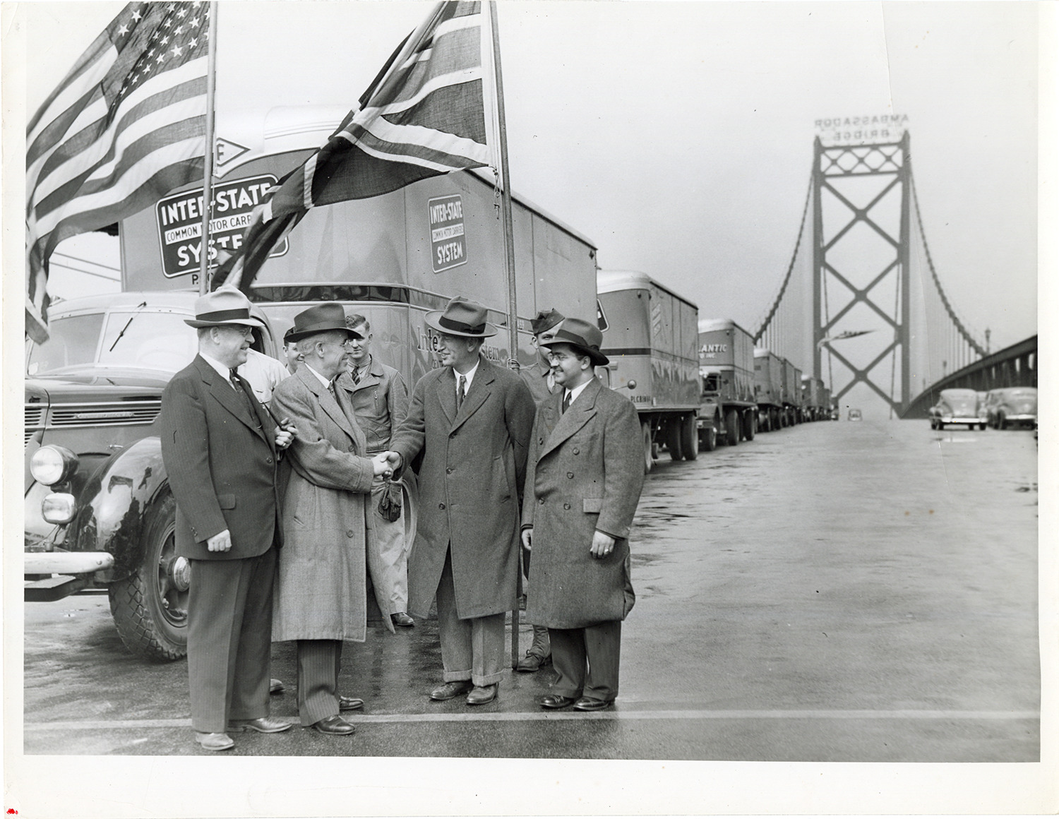 View of group of men shaking hands on the Ambassador Bridge, at the Detroit, Michigan and Windsor, Ontario border, with a convoy of White trucks in background. American and Canadian flags in foreground.