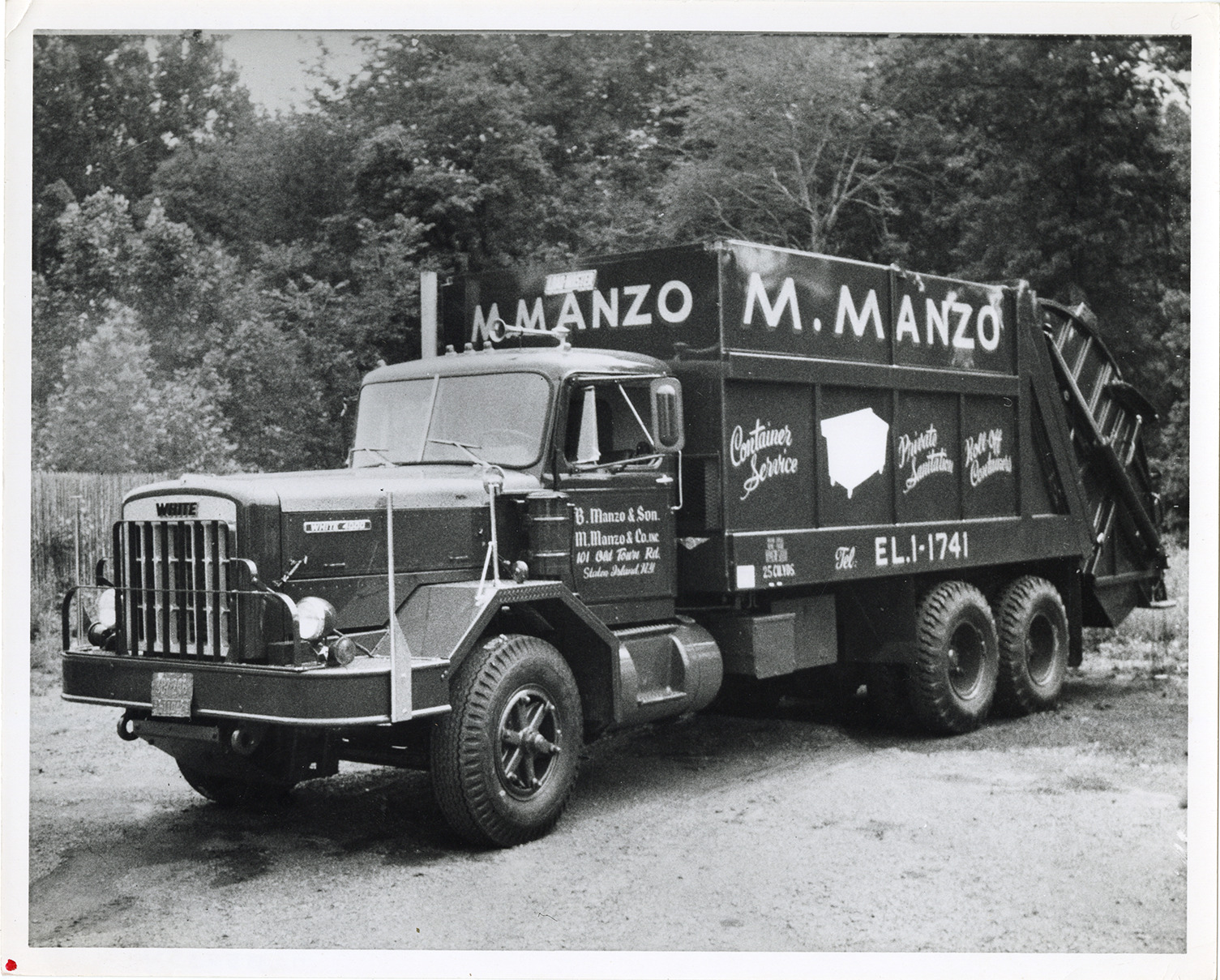 View of a White garbage truck, owned by B. Manzo & Son, M. Manzo & Co. Inc. Lettered on truck: "B. Manzo & Son, M. Manzo & Co., Inc. 101 Old Town Rd., Staten Island, N.Y. M. Manzo. Container service, private sanitation, roll off containers. Tel. EL. 1-1741." Stamped on back: "Please credit Foto Arts Inc. 2169 St. Clair Avenue, Cleveland, Ohio 44114, Area code [undecipherable] Phone: 621-3344."