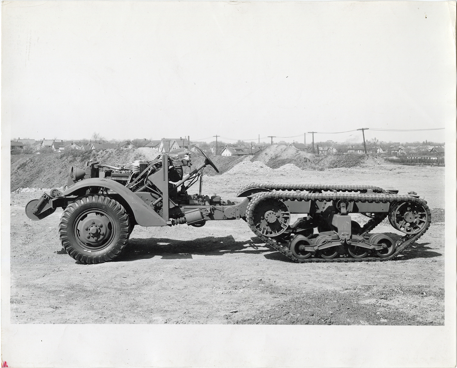 View of a White M16 Half-Track vehicle chassis. Typed on back: "Chassis construction, Half-trac." Stamped on back: "White Motor Company, Cleveland. 310505. Advertising Department."