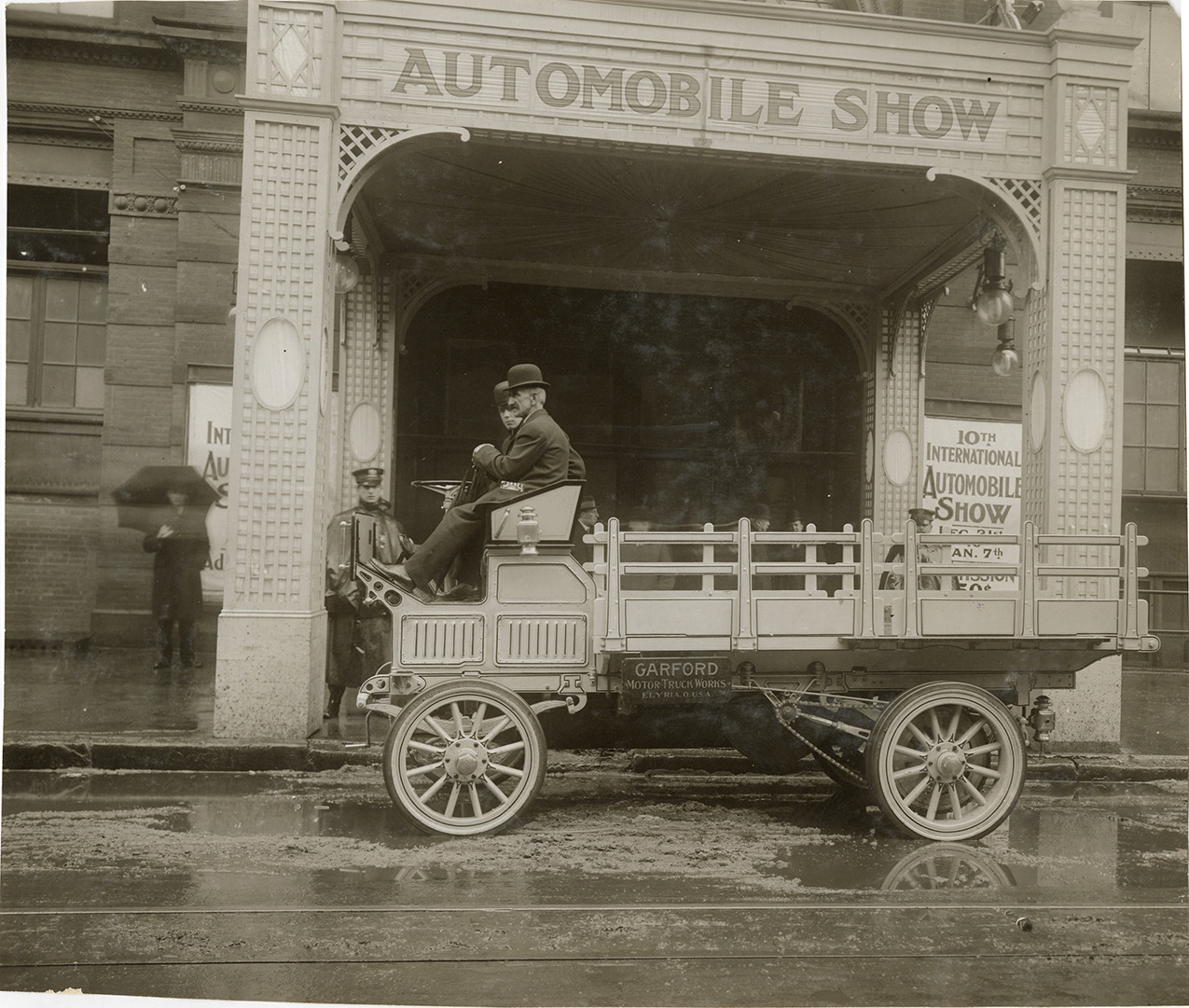 View of motorists in Garford truck parked in front of the entrance to the 10th International Automobile Show. Sign on truck reads: "Garford Motor Truck Works, Elyria, O., U.S.A." Stamped on back: "Spooner & Wells, Inc., photographers, telephones 3472-3473 Columbus, 1931 Broadway, New York." Handwritten on back: "Garford."