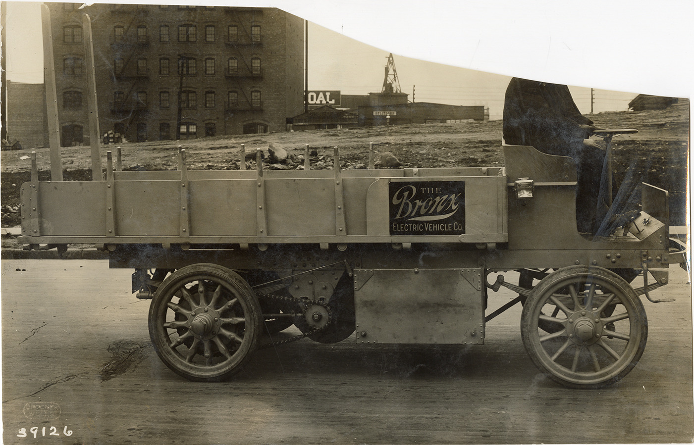 View of motorist in a 1911 Bronx electric truck. Sign on truck reads: "The Bronx Electric Vehicle Co." Stamped on back: "Spooner & Wells, Inc., photographers, telephones 3472-3473 Columbus, 1931 Broadway, New York." Handwritten on back: "Bronx Electric Vehicle, 1911."