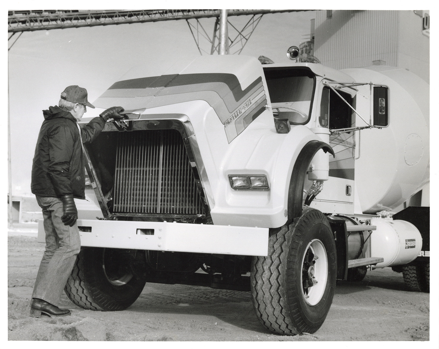 View of a man looking at the radiator of a White Western Star truck. Stamped on back: "Foto Arts Inc., 3016 Payne Avenue, Cleveland, Ohio 41114. Area code 216. Phone: [undecipherable]."