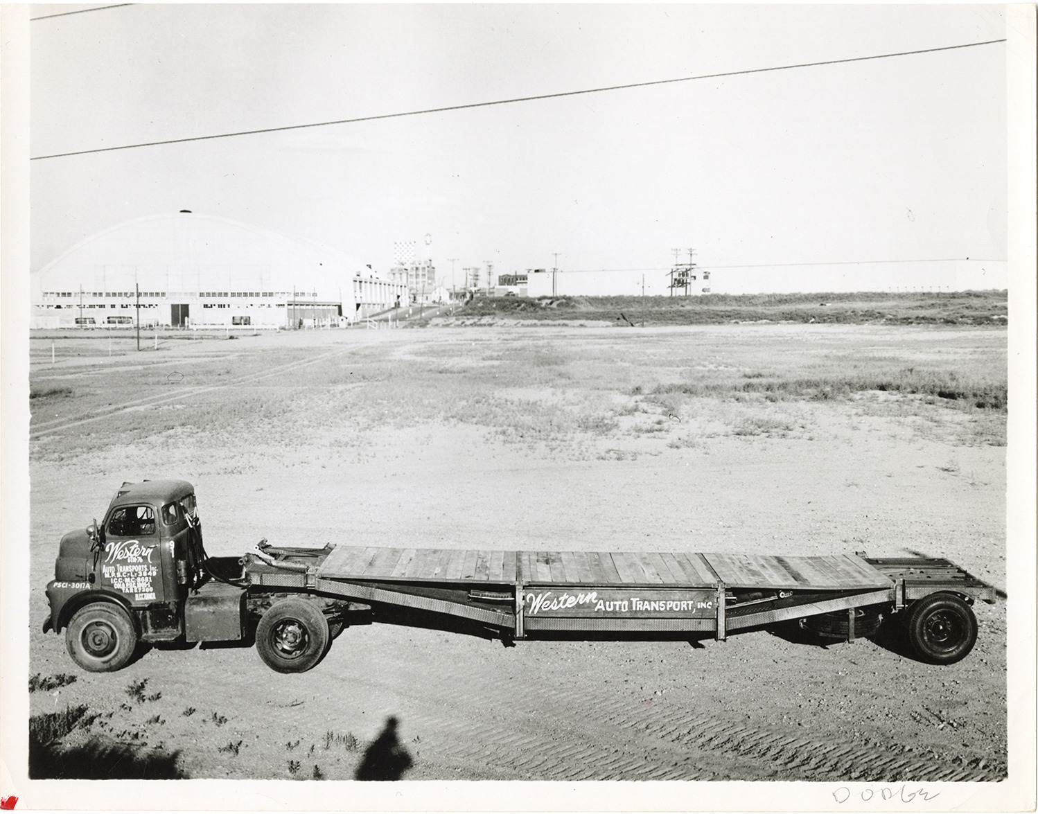 View of a Dodge truck and trailer, owned by Western Auto Transport, Inc. Lettered on cab and trailer: "Western Auto Transport, Inc." Handwritten on front: "Dodge."