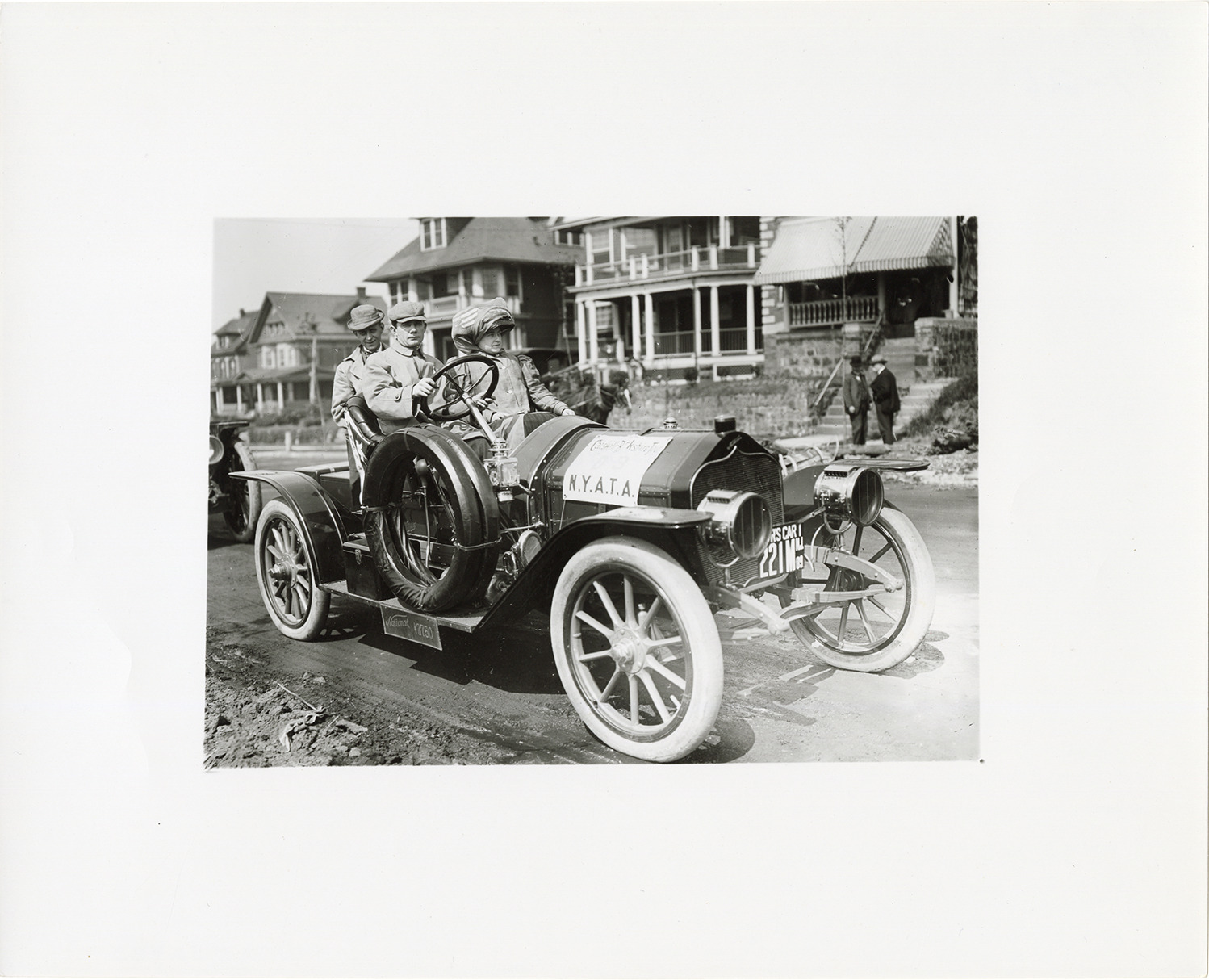 View of W.C. Poertner and passengers in National car during the 1909 Catskill-Berkshire Tour sponsored by the New York Automobile Trade Association. The tour covered a route through New York, New Jersey, Massachusetts and Connecticut. Handwritten on back: "National, 1909."