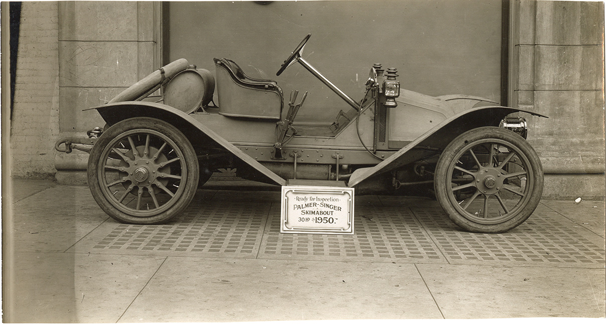 View of a Palmer-Singer Skimabout car. Sign in foreground reads: "Ready for inspection, Palmer-Singer Skimabout, 30 HP, $1950." Stamped on back: "Lazarnick, photographic illustrations, 230 Park Avenue, New York Central Building, New York City, Tel. Vanderbilt 3-0011-2-3-4." Handwritten on back: "Palmer-Singer, 1907-08."