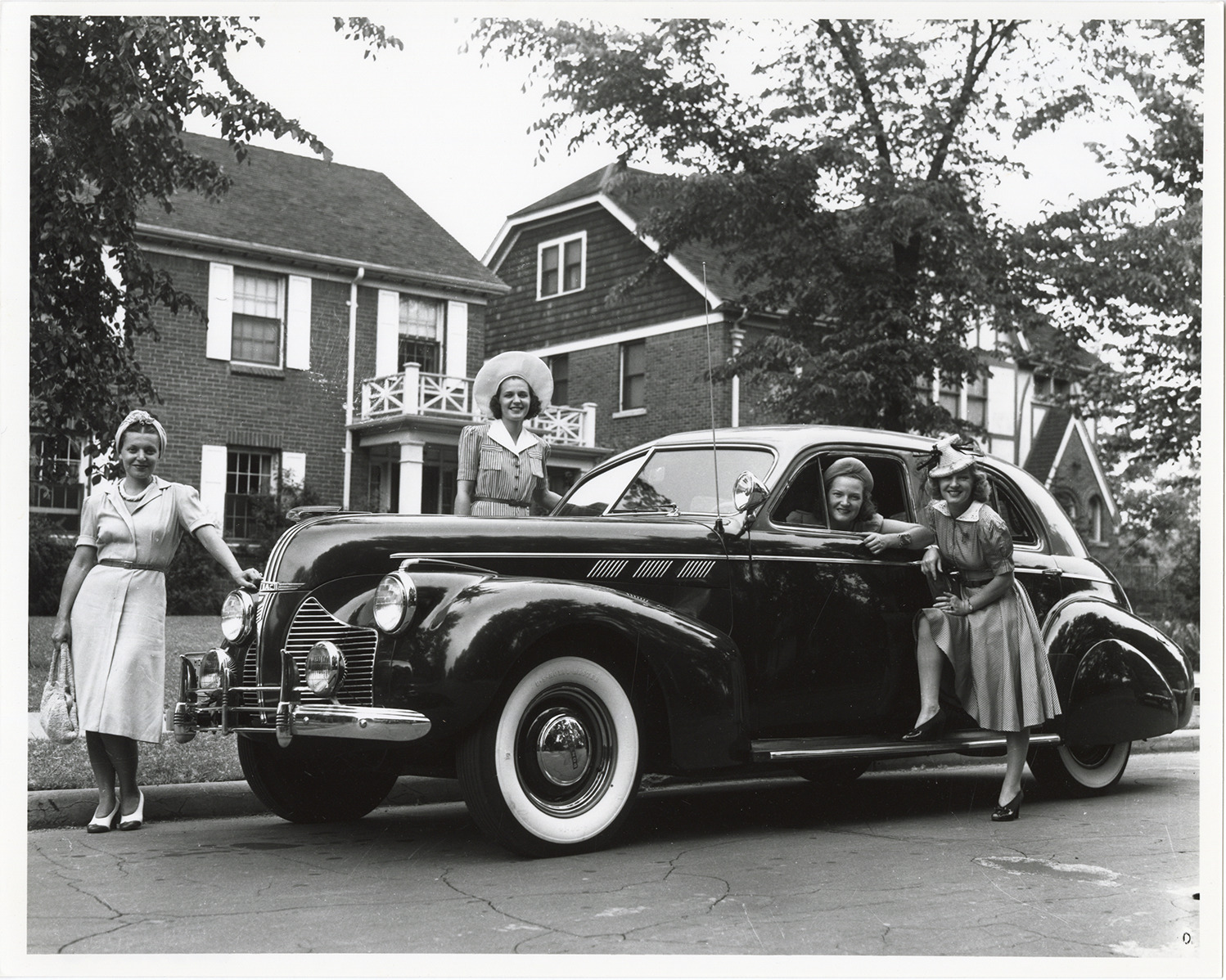 View of four women posing with a 1940 Pontiac car. Brick houses in background. Handwritten on back: "1940 Pontiac."