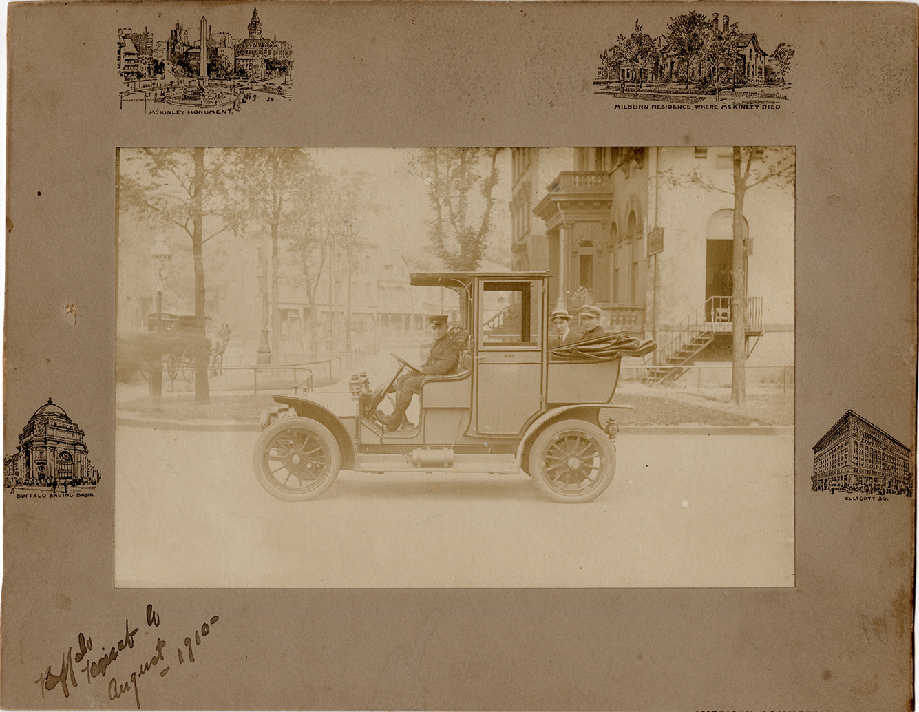 View of driver and passengers posing in a 1909 Thomas taxicab. Handwritten on front: "Buffalo taxicab, August, 1910." Mat board features line drawings of Buffalo, New York attractions -- Buffalo Savings Bank, McKinley Monument, Milburn residence, where McKinley died and Ellicott Square. Handwritten on back: "1909 Thomas cab."