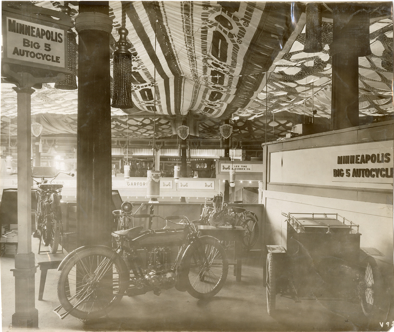View of Minneapolis Big 5 autocycles on display at trade show. Motorcycles and cab in exhibit; sign on left reads: "Minneapolis Big 5 autocycle." Stamped on back: "Spooner & Wells, Inc., photographers, telephones 3472-3473 Columbus, 1931 Broadway, New York." Handwritten on back: "Motorcycles--Minneapolis, 1911-12."