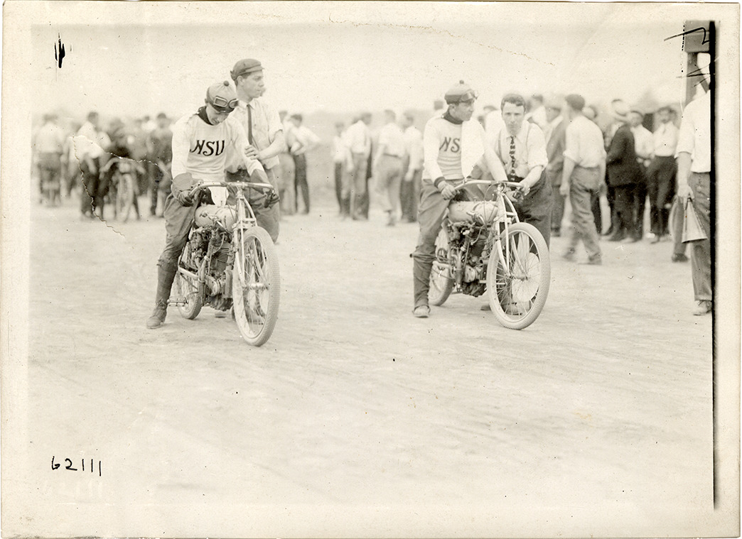 Favorite this☆ Motorcyclists with NSU motorcycles Description: View of two motorcyclists with NSU motorcycles at the start of an unidentified race. Spectators in background. Handwritten on back: "Motorcycles--NSU, 1910." Details Resource ID: na052470 Subject: NSU motorcycle Motorcyclists Photographic prints Date Issued: 1910 Format: 1 photographic print ; 5 x 7 in. Member of: National Automotive History Collection Lazarnick Collection Filing Location: Motorcycles--N.S.U. Rights: Physical rights are retained by DPL. Copyright is retained in accordance with U.S. copyright laws.
