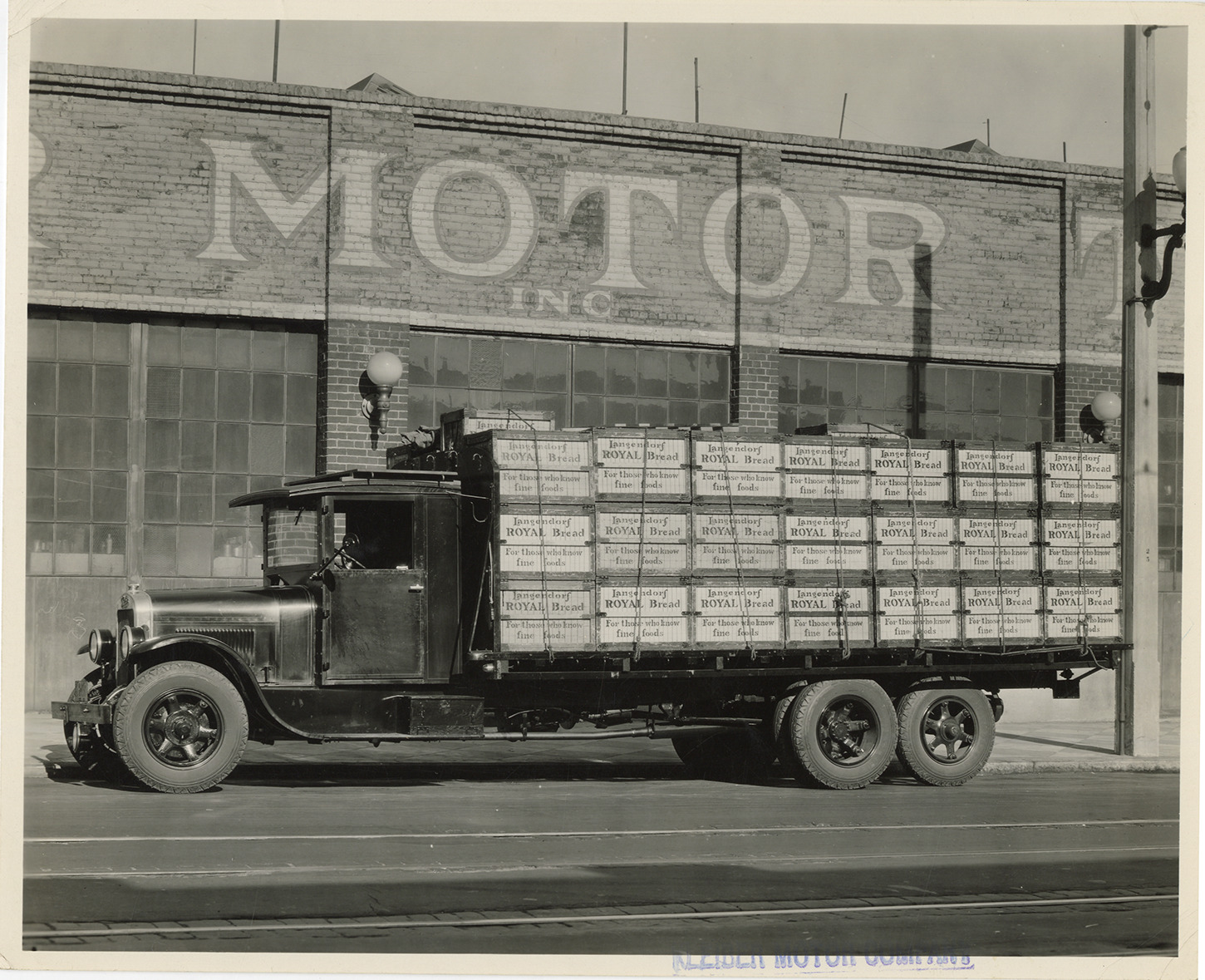 View of a Kleiber truck with a load of Langendorf Royal bread. Stamped on front: "Kleiber Motor Company." Stamped on back: "Kleiber Motor Company, 1480 Folsom St., San Francisco, Cal." and "Morton photographs. Morton & Co., commercial photography. 515 Market St., San Francisco, Calif. Telephone Garfield 4320." Handwritten on back: "Kleiber, ca. 1930."