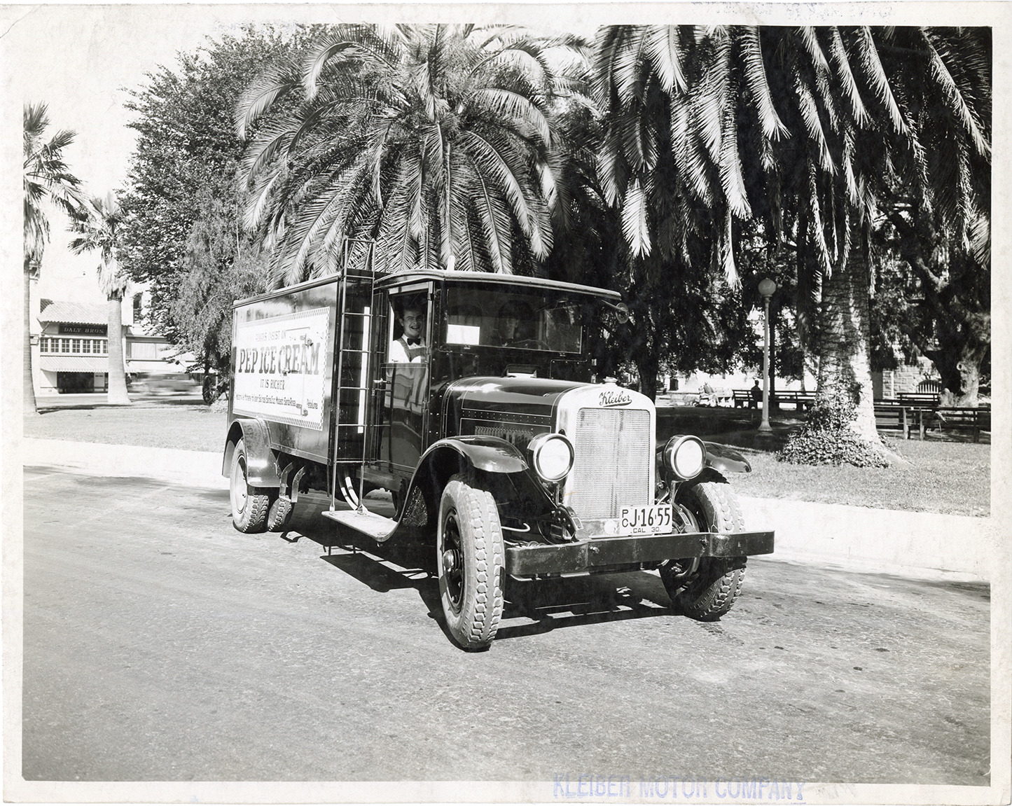 View of a Kleiber truck, owned by Pep Ice Cream. Sign on side of truck reads: "Always insist on Pep ice cream, it is richer. Watsonville, Monterey, Hollister, Salinas, Santa Cruz, Modesto, Santa Rosa, Petaluma." Stamped on front: "Kleiber Motor Company." Stamped on back: "Kleiber Motor Company, 1480 Folsom St., San Francisco, Cal." Handwritten on back: "Motor trucks--Kleiber, ca. 1930."