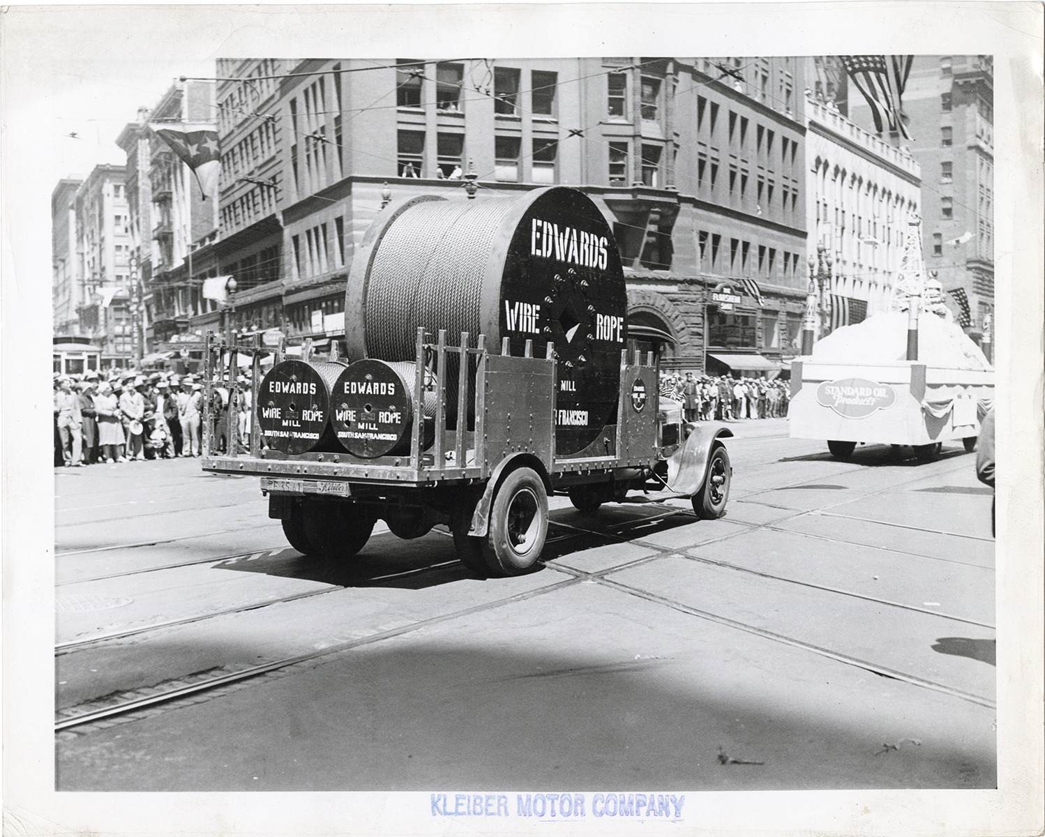 View of a Kleiber truck, owned by Edwards Wire Rope Mill of San Francisco, California, in a parade. Truck is hauling several spools of wire rope. Standard Oil float on right; spectators and buildings in background. Stamped on front: "Kleiber Motor Company." Stamped on back: "Kleiber Motor Company, 1480 Folsom St., San Francisco, Cal." Handwritten on back: "Motor trucks--Kleiber, ca. 1930."