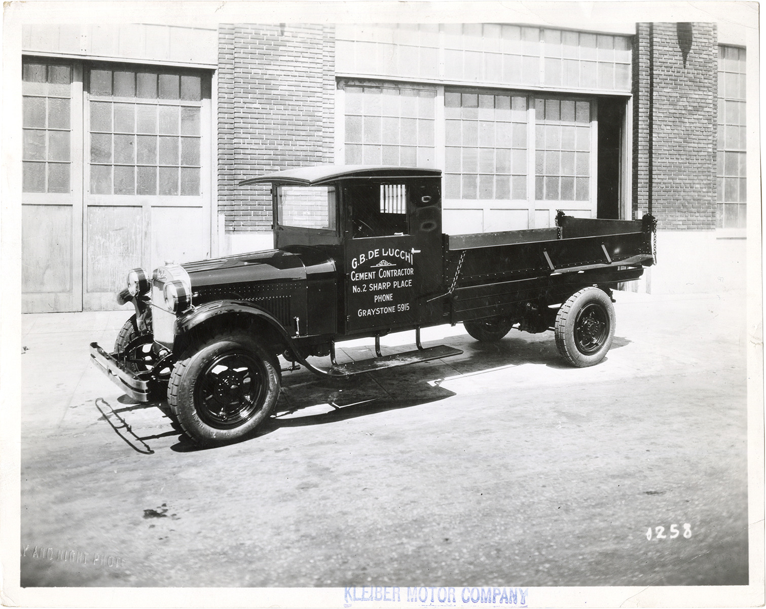View of a Kleiber truck, owned by G.B. De Lucchi, cement contractor. Lettered on side of truck: "G.B. De Lucchi, cement contractor. No. 2 Sharp Place, phone Graystone 5915." Stamped on front: "Kleiber Motor Company." Stamped on back: "Kleiber Motor Company, 1480 Folsom St., San Francisco, Cal." Handwritten on back: "Motor trucks--Kleiber, ca. 1930."