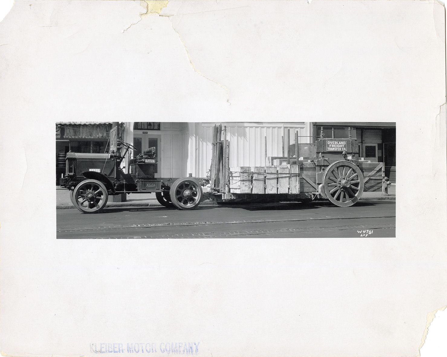 View of a Kleiber truck, owned by the Overland Freight Transfer Co., hauling a trailer. Stamped on front: "Kleiber Motor Company." Stamped on back: "Kleiber Motor Company, 1480 Folsom St., San Francisco, Cal." Handwritten on back: "Motor trucks--Kleiber."